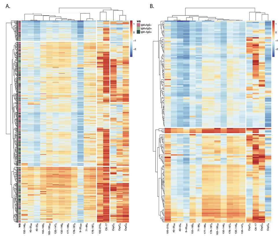 Figure 6. Hierarchical clustering of rOspC and OspC-derived reactivity in diagnostic and PTLD serum. Heatmaps were generated using diagnostic (A) and PTLD (B) serum sample MFIs (indexed and log10 transformed). Rows represent individual samples and columns represent the panel of antigens. The color scales of A and B are identical to one another (allowing for direct comparison), with 0 representing the positivity cutoff (as seen in Figure 4). Annotation of the diagnostic samples (A) with Western blot profile data (previously described in the Materials and Methods) is designated by the legend. The columns were subjected to hierarchical clustering by correlation and the rows were clustered by Euclidean distance to better visualize patterns in reactivity profiles.