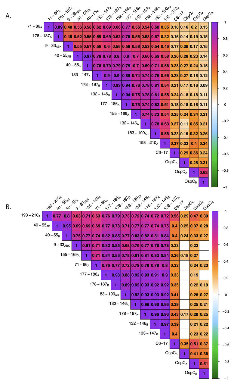 Figure 5. Correlation matrices of rOspC and OspC-derived peptide reactivity in diagnostic and PTLD serum. Diagnostic (A) and PTLD (B) serum sample MFIs (indexed and log10 transformed) were subjected to Spearman’s Rank correlation. Only significant correlation coefficients (rs) are displayed (confidence level = 0.95). The degree and direction of correlation is indicated by the color scale. Interpretations of the strength of each correlation was conducted as such: >0.7 indicates a strong correlation, 0.5 – 0.7 is moderate, 0.3 – 0.5 is weak, and 0.0 – 0.3 is negligible.