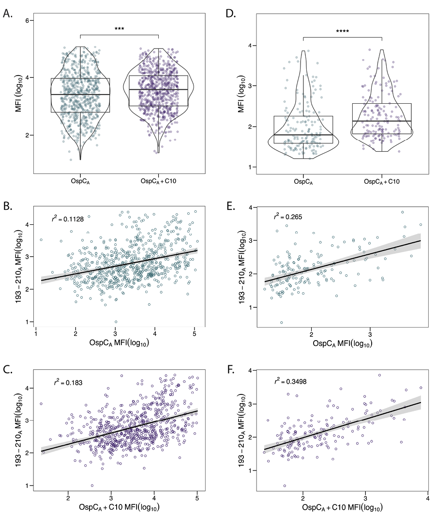 Figure 2. Correlation between OspCA reactivity and C10 region. Diagnostic (n=686) and PTLD (n=158) samples were subjected to Luminex with OspCA, OspCA+C10, and 193-210A as described in the Materials and Methods. OspCA MFIs were evaluated against OspCA+C10 for diagnostic (A) and PTLD (D) samples. Significance was determined by Mann-Whitney U test. *, P < 0.05. To examine the contribution of the C10 region to OspCA reactivity, MFIs for peptide 193-210A were plotted (on the y-axis) versus MFIs from OspCA and OspCA+C10 (on the x-axis) for diagnostic samples (B, C) and PTLD samples (E, F). Best fit lines and confidence intervals (level = 0.95) were added to each plot using a linear regression model. Adjusted R-squared (r2) values were calculated in R.