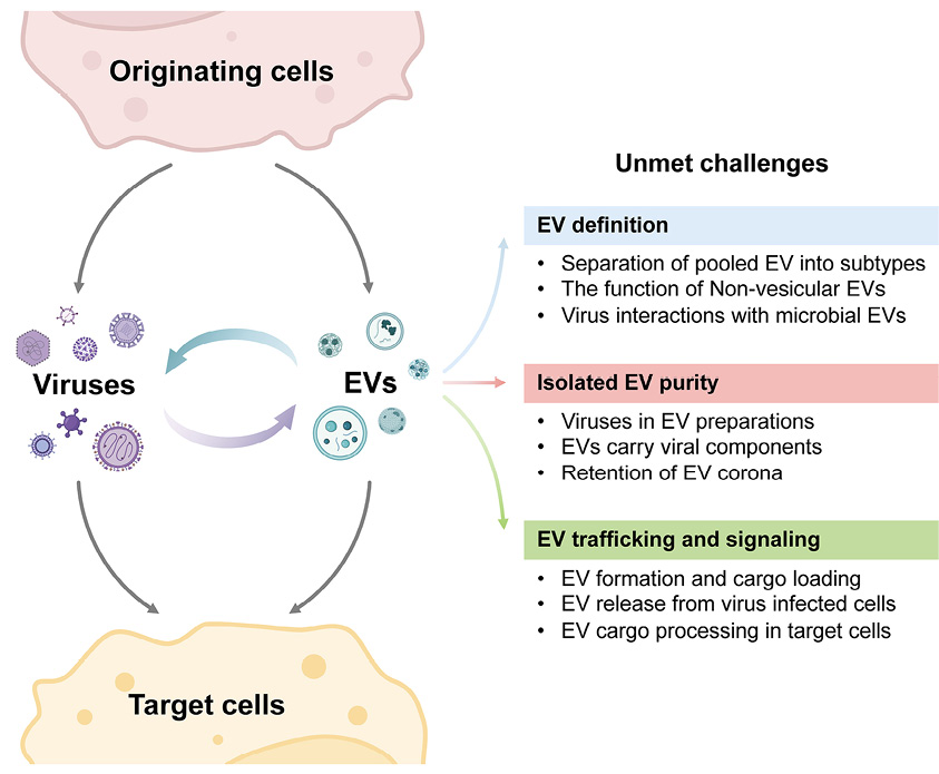 Defining the key determinants that shape the interaction of EVs with viruses, whether cooperative or antagonistic, requires deeper understanding of EV biology. We must also ensure that EV-probing technologies do not create technical artifacts that are irrelevant to EV-virus crosstalk. In the section below, we define key investigative issues and their implications, all from the viewpoint of EV biology, and formulate a set of unmet challenges.