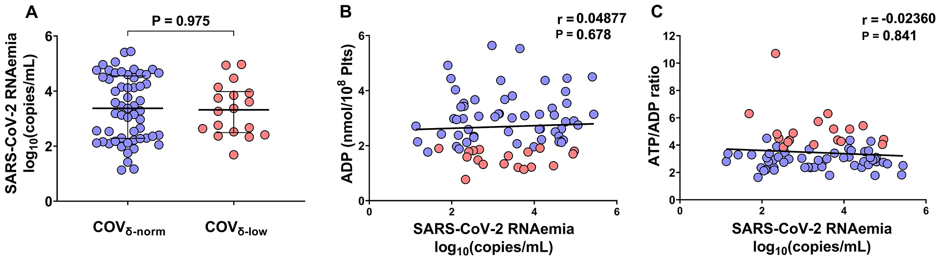 Firstly, we assessed SARS-CoV-2 RNAemia in the study population. There were no statistically significant differences in SARS-CoV-2 RNAemia between the COVδ-norm and COVδ-low groups [3.4 median log10(copies/mL), IQR 2.3 to 4.6 vs 3.3 median log10(copies/mL), IQR 2.5 to 4.0, respectively, P=0.9755] (Figure 1A). Furthermore, no statistically significant correlations were observed between the markers used to assess platelet degranulation and SARS-CoV-2 RNAemia, neither when considering the entire cohort (ADP: r=0.05, P=0.678; ATP/ADP ratio: r=-0.024, P=0.841) (Figure 1B-C) nor when patients were stratified based on their platelet degranulation status (COVδ-norm: ADP content r=0.078, P=0.565; ATP/ADP ratio: r=-0.025, P=0.856; COVδ-low: ADP content r=-0.046, P=0.855; ATP/ADP ratio: r=-0.168, P=0.504). These findings do not support an association of SARS-CoV-2 RNAemia with platelet degranulation.