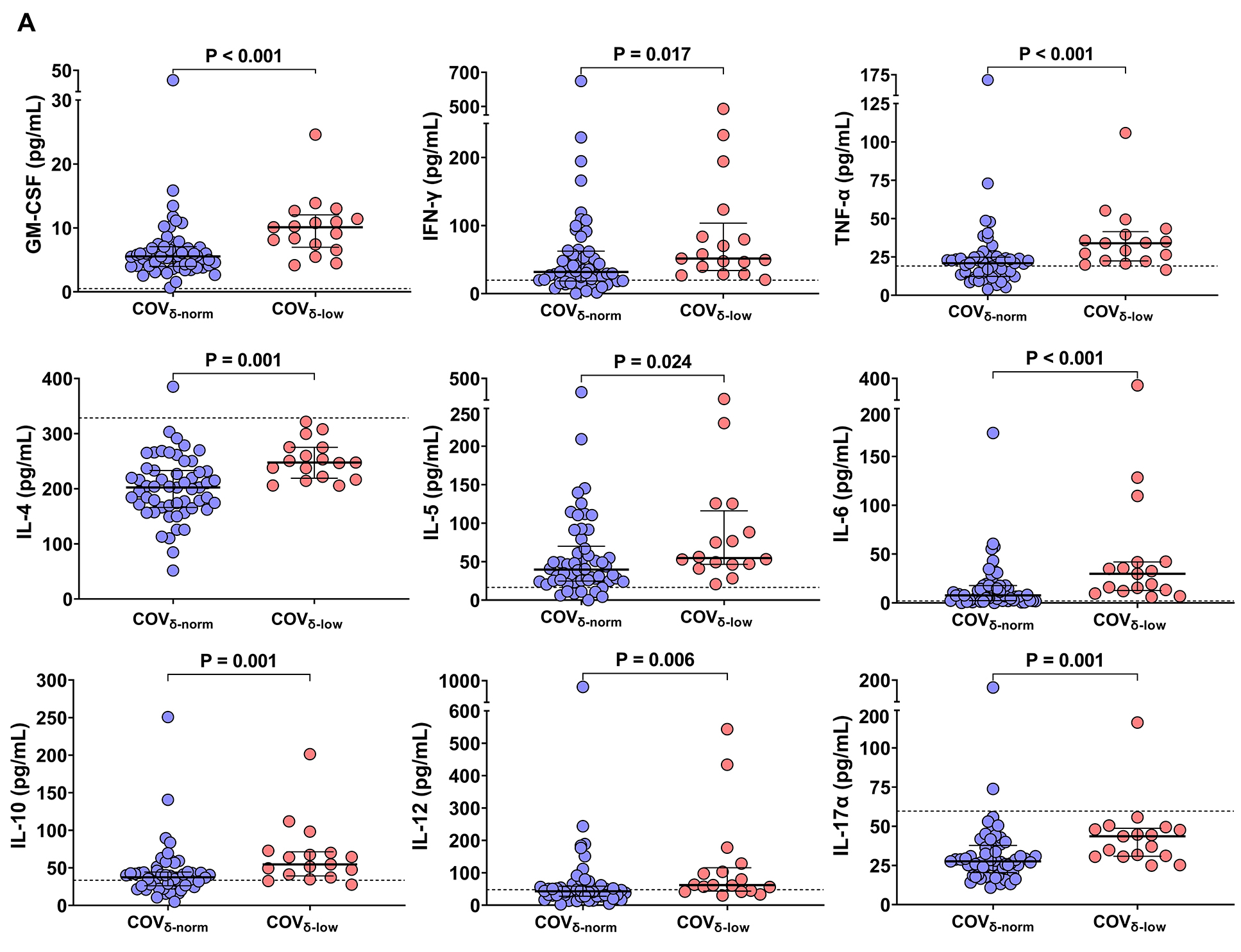 Next, we evaluated the peripheral cytokine milieu in both patient groups. Significantly higher levels of GM-CSF, IFN-γ, TNF-α, IL-4, IL-5, IL-6, IL-10, IL-12, and IL-17A were observed in the COVδ-low group compared to the COVδ-norm group (Figure 2A), with the exception of IL-2 and IL-9, which were detectable only in 3 patients (data not shown). Median cytokine and chemokine values of 7 healthy participants sampled before the pandemic are included as reference (Figure 2A).