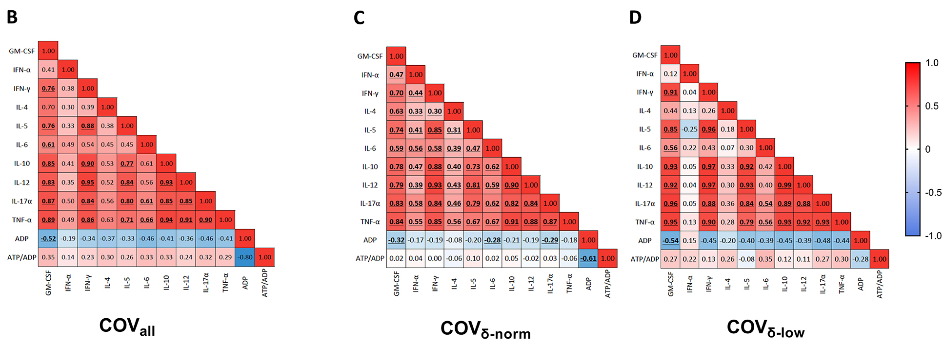 Since ADP is stored in platelet dense granules and released upon activation, intracellular ADP levels drop following degranulation. Meanwhile, ATP levels remain relatively stable, resulting in an increased ATP/ADP ratio. When evaluating the correlation between plasma cytokine and chemokine levels and ADP content across the entire patient cohort, a trend towards a negative correlation was observed, reaching statistical significance for GM-CSF (r=-0.52, P<0.001) (Figure 2B). Similar patterns were noted when stratifying patients based on their platelet degranulation status. The correlation between ADP and GM-CSF remained significant in both groups (COVδ-norm: r=-0.32, P=0.02; COVδ-low: r=-0.54, P=0.03) (Figure 2C-D). Statistical significance was also achieved, in the COVδ-norm group only, for IL-6 (r=-0.28, P=0.04) and IL-17α (COVδ-norm: r=-0.29, P=0.03) (Figure 2C). The positive correlation trend that we observed between plasma cytokine and chemokine levels with the ATP/ADP ratio in the overall cohort appeared to be mainly driven by the COVδ-low group (Figure 2D). Negative correlations between intracellular ADP levels and plasma cytokine concentrations, along with positive correlations between the ATP/ADP ratio and the same cytokines, indicate that greater platelet degranulation, reflected by lower ADP content and a higher ATP/ADP ratio, is associated with increased systemic inflammation. These findings suggest that plasma cytokine and chemokine levels are associated with platelet degranulation, with a stronger association in patients with more pronounced platelet degranulation. Indeed, whereas in the COVδ-norm group, only ADP appears to be negatively correlated with inflammation; in the COVδ-low group, both parameters used to assess platelet degranulation appear to be associated with inflammation. Specifically, ADP was negatively correlated with inflammation, and as expected, ATP/ADP positively correlated with inflammation.