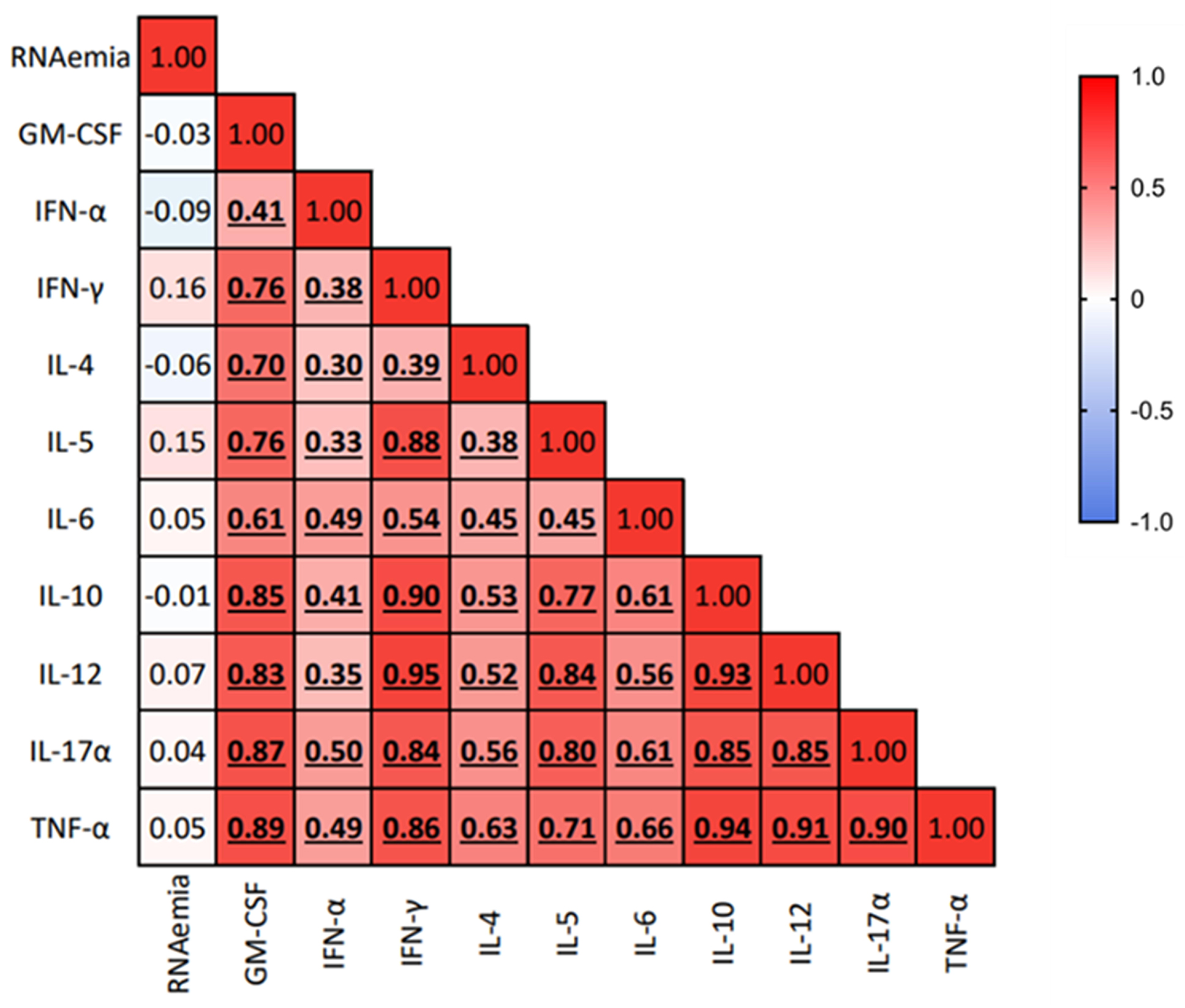 Figure 3. Association of SARS-CoV-2 RNAemia with the peripheral cytokine milieu. Heatmap showing correlations between SARS-CoV-2 RNAemia log10(copies/mL) and plasmatic chemokine and cytokine levels (pg/mL). Spearman’s correlation test was used to assess correlation between variables; the color gradient represents the correlation coefficient (r); numerical values within each cell indicate the r value. P-values <0.05 are considered statistically significant, and statistically significant correlations are highlighted in bold and underlined.