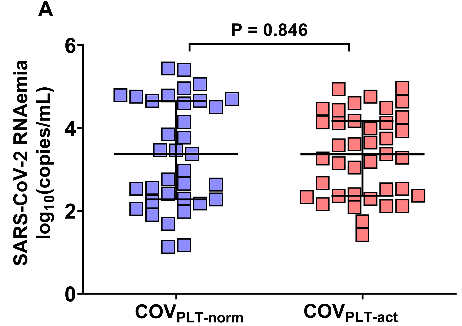 To investigate the relationship between platelet activation, SARS-CoV-2 RNAemia, and systemic inflammation, we stratified patients with COVID-19 into 2 groups based on PMAs. The cut-off for PMAs (23.02%) was derived from measurements in 36 healthy donors. Patients with PMA levels below this threshold were classified as COVPLT-norm (n=39), whereas those with PMA levels above the threshold were designated as COVPLT-act (n=35). SARS-CoV-2 RNAemia did not differ significantly between the 2 groups (COVPLT-norm: median 3.4 log₁₀[copies/mL], IQR 1.4–4.2; COVPLT-act: median 3.4 log₁₀[copies/mL], IQR 2.3–4.7; p=0.846) (Figure 4A).