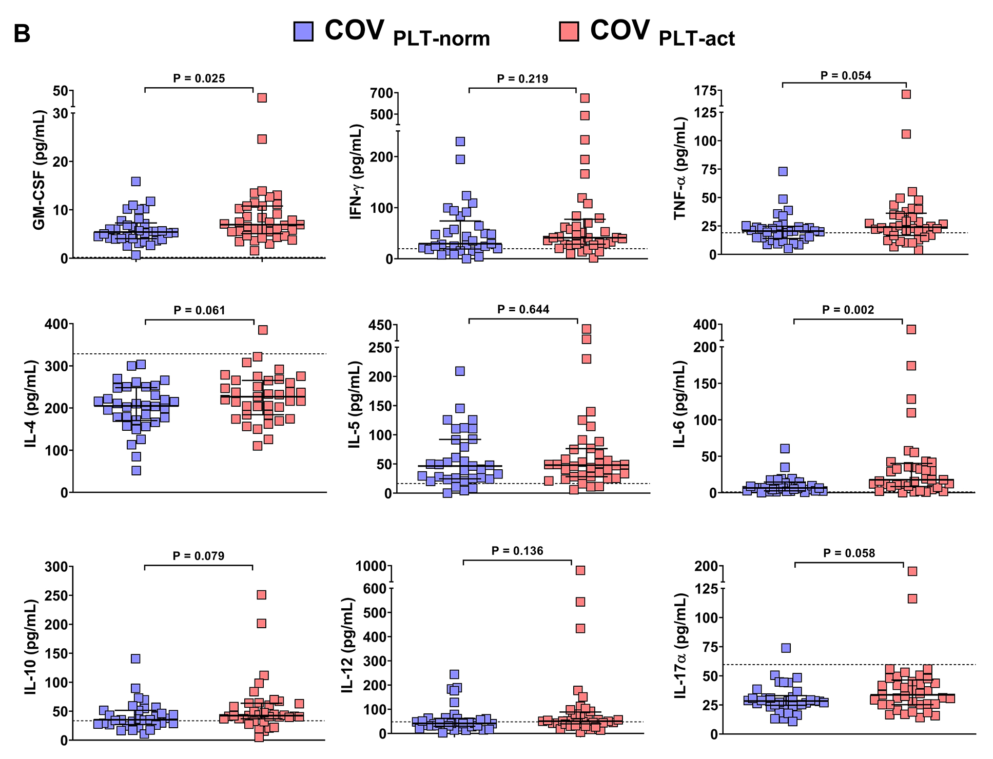 Figure 4. Association of platelet activation with SARS-CoV-2 RNAemia and the peripheral cytokine milieu. Patients with COVID-19 were categorized into two groups according to the cut-off for PMAs measured in 36 healthy subjects: COVPLT-norm (n=39) had PMA levels below the cut-off of 23.02%, whereas COVPLT-act (n= 35) had PMA levels above the cut-off. (A) Plasmatic SARS-CoV-2 RNAemia in patients with COVID-19 without circulating activated platelets (COVPLT-norm, n=35) and with circulating activated platelets (COVPLT-act, n=39) [COVPLT-norm: 3.4 median log10(copies/mL), IQR 1.4-4.2, vs COVPLT-act: 3.4 median log10(copies/mL), IQR 2.3-4.7, respectively, p=0.846]. (B) Plasmatic chemokine and cytokine levels in COVID-19 patients without circulating activated platelets (COVPLT-norm) and with circulating activated platelets (COVPLT-act). GM-CSF (n=34 and n=37), IFN-γ (n=33 and n=36), TNF-α (n=33 and n=37), IL-4 (n=34 and n=37), IL-5 (n=33 and n=36), IL-6 (n=33 and n=36), IL-10 (n=32 and n=36), IL-12 (n=33 and n=36), IL-17A (n=34 and n=37). Median values with interquartile ranges (IQR) are shown for each group of patients. Data were analyzed using the Mann–Whitney or t-test, as appropriate, and the Spearman’s correlation test. Statistical significance has been assumed for two-sided P-values <0.05.