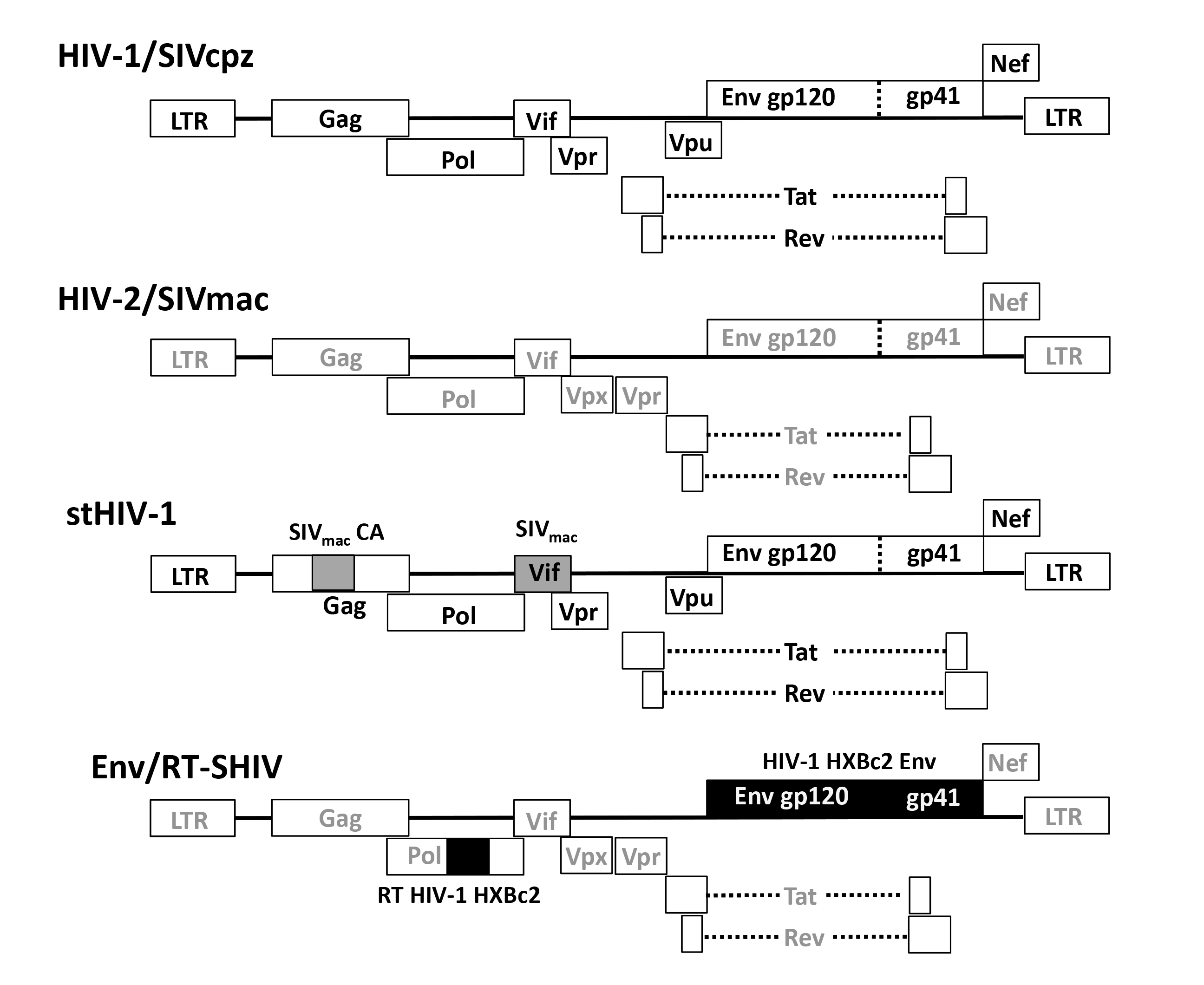 Figure 2. Schematic diagram of the genomic organization of HIV-1, HIV-2, SIV, stHIV-1 and SHIV viral genomes. HIV-1/SIVcpz encodes the vpu gene but lacks the vpx gene. HIV-2/SIVmac encodes vpx but not vpu. The gag polyprotein encodes matrix (MA), capsid (CA), and nucleocapsid (NC). The pol genomic region encodes the viral enzymes protease (PR), reverse transcriptase (RT), and integrase (IN). Gray- and black-shaded boxes indicate SIV- and HIV-derived sequences, respectively. Abbreviations: SIV, simian immunodeficiency virus; stHIV-1, simian-tropic human immunodeficiency virus; SHIV, simian-human immunodeficiency virus; SIVcpz, chimpanzee-derived; SIVmac, macaque-derived; RT, reverse transcriptase; LTR, long-terminal repeat; env, envelope glycoprotein.
