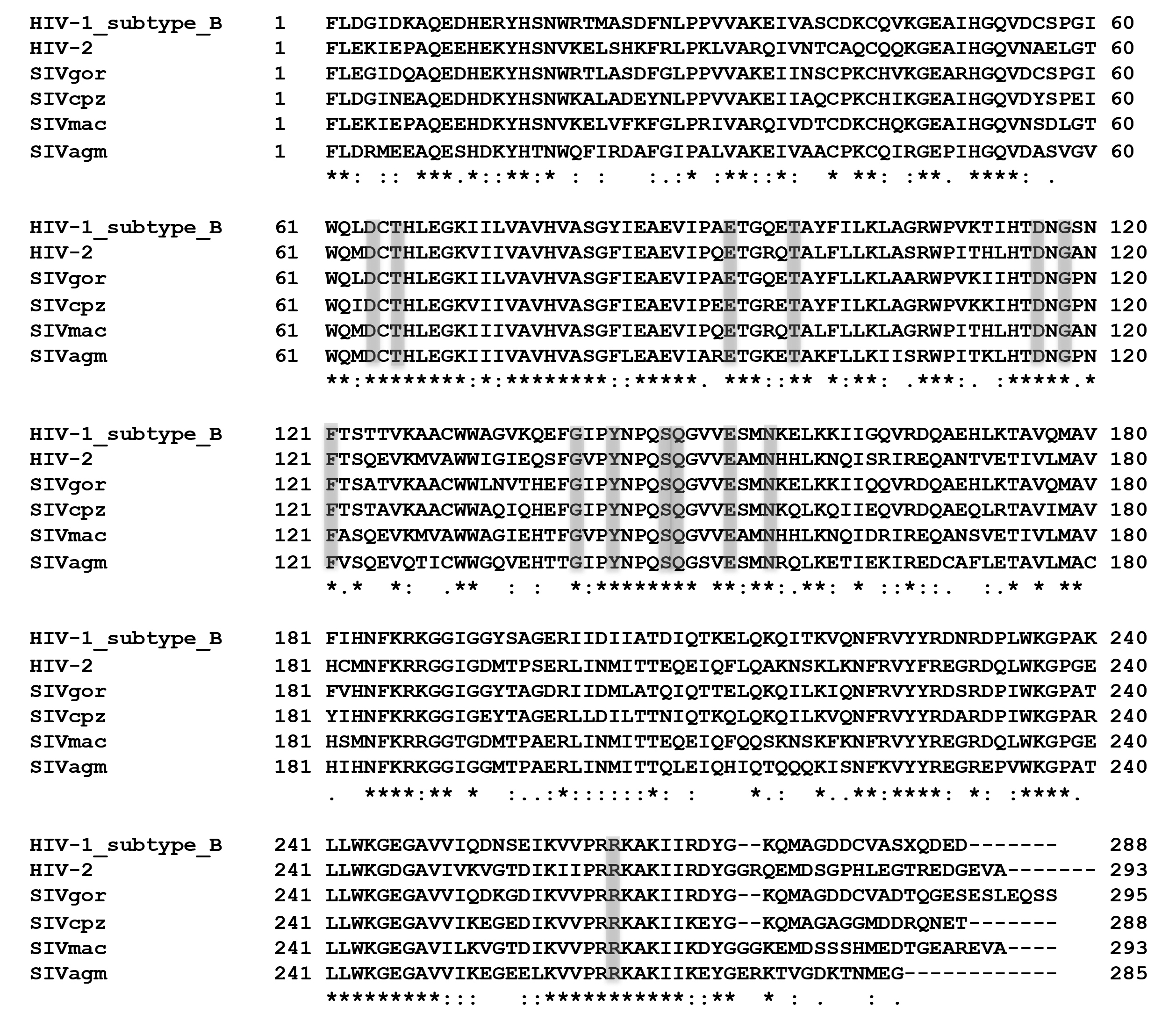 Figure 1. Multiple amino acid sequence alignment of HIV-1 subtype B and different SIV integrases. The HIV-1 subtype B integrase sequence is provided as a reference. Identical amino acid residues that are conserved across all six proteins are marked with an asterisk (*); residues similar to each other are marked with a colon (:); those that are less similar are marked with a period (.); and those that are not similar are not marked. Catalytic triad residues (D64, D116, and E152) and residues involved in main resistance pathways against integrase inhibitors (T66, E92, T97, G118, F121 G140, Y143, S147, Q148, N155, and R263) are shaded in gray. The GenBank accession numbers for the sequences used in this alignment are DQ676870 (HIV-1 subtype B), DQ307022 (HIV-2) FJ424864 (SIVgorCP2139.1con), EF394356.1 (SIVcpzTan1.910), M33262 (SIVmac239), and U58991 (SIVagmTan-1). The multiple sequence alignment was performed using Clustal Omega software [27-29].