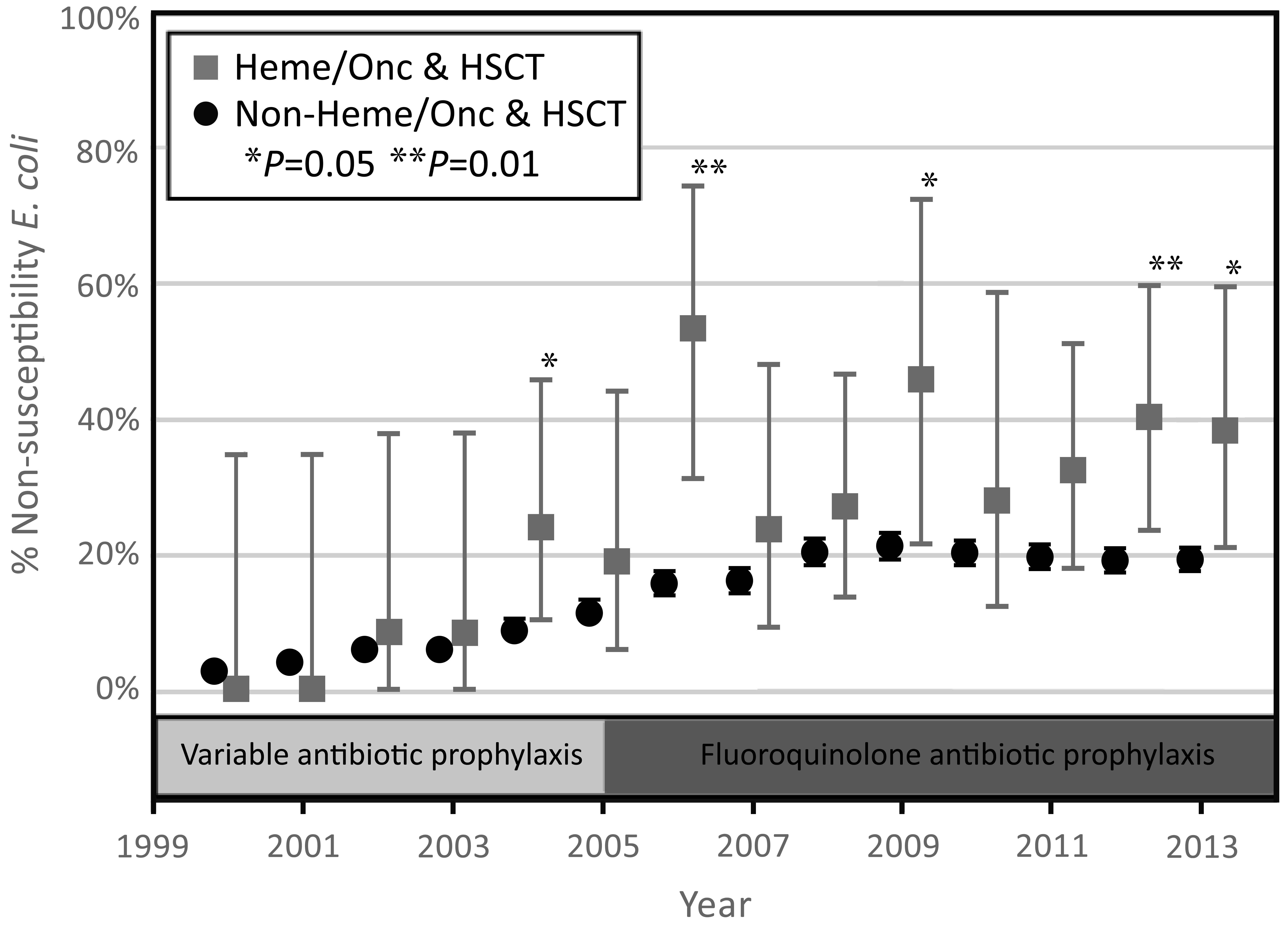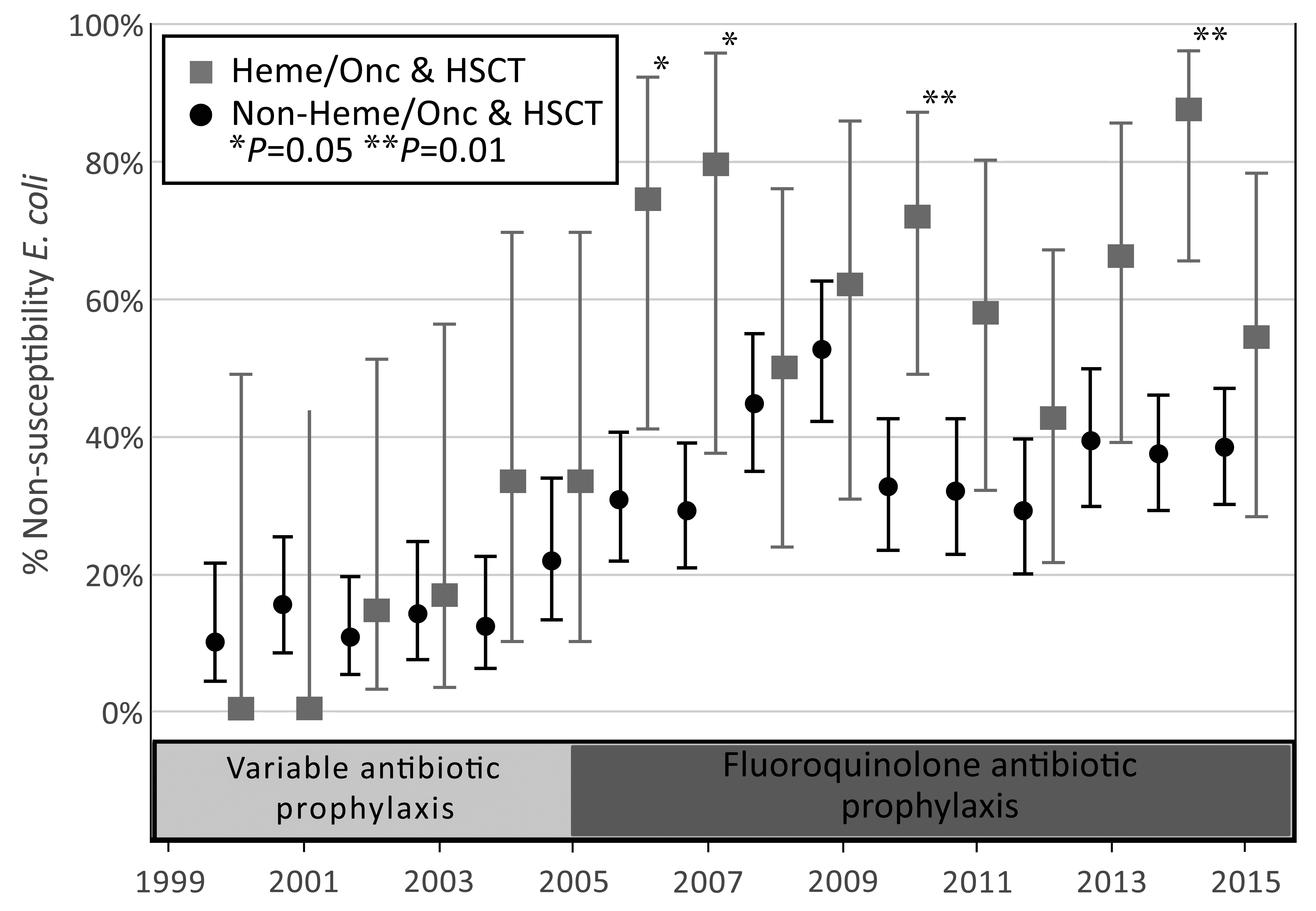 Figure 1. Trend in fluoroquinolone non-susceptibility rates in first E. coli positive blood culture by year of occurrence, 2000-2015. The error bars represent 95% confidence intervals. HSCT, hematopoietic stem cell transplant.
