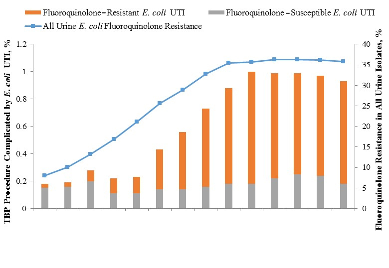 Results: 245,618 patients undergoing 302,168 TBP procedures from 2000 through 2013 were included in the cohort study, and 59,469 patients undergoing TBP from 2011 through 2013 were included in the nested case-control study. Between 2000 and 2013, there was a 5-fold increase in the incidence of E. coli UTI (0.18%–0.93%) and a 4-fold increase in the incidence of E. coli bacteremia (0.04%–0.18%) after TBP that was attributable to an increase in the incidence of fluoroquinolone-resistant E. coli UTI (0.03%–0.75%) and bacteremia (0.01%–0.14%). The increasing incidence of fluoroquinolone-resistant E. coli infections after TBP occurred in parallel with increasing rates of fluoroquinolone-resistance in all urinary E. coli isolates. By multivariable logistic regression analysis, independent risk factors for fluoroquinolone-resistant E. coli UTI after TBP included diabetes mellitus, fluoroquinolone exposure, prior hospitalization, and prior cultures with fluoroquinolone-resistant gram-negative bacilli.