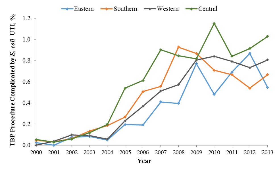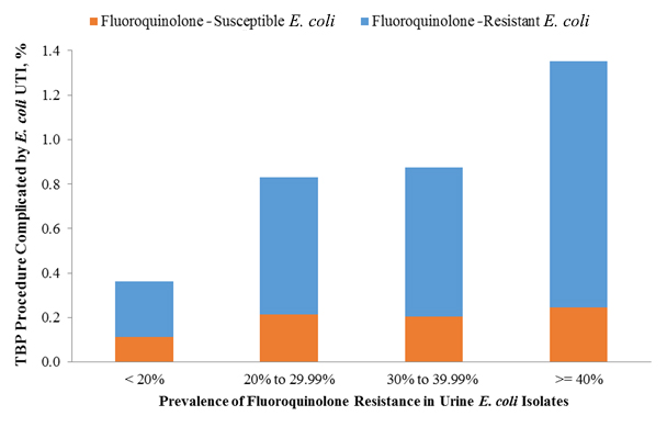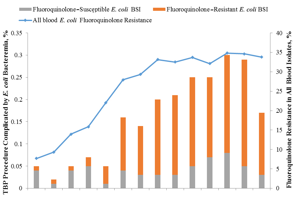 Conclusion: In the Veterans Affairs Healthcare System, the incidence of E. coli infection after TBP has increased significantly since 2000 due to a dramatic rise in infections with fluoroquinolone-resistant E. coli.