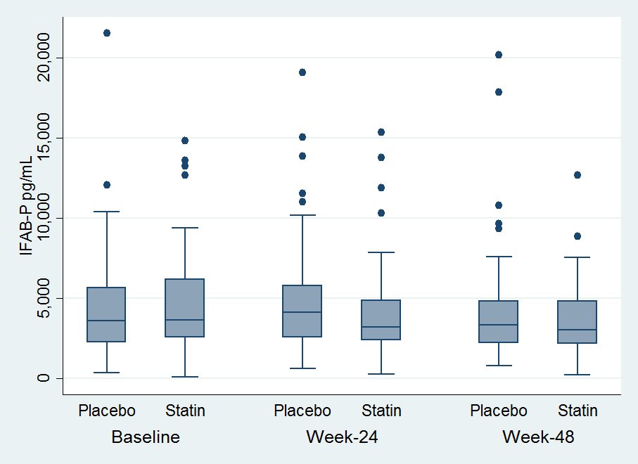 Methods: SATURN-HIV is a randomized, double-blind, placebo-controlled trial assessing the effect of rosuvastatin (10mg/daily) on markers of cardiovascular disease, inflammation, and immune activation in ART-treated patients. Gut-barrier integrity was assessed by the surrogate markers intestinal fatty acid binding protein (I-FABP), a marker of enterocyte death, and zonulin-1, a marker of gut epithelial cell function. Levels of lipopolysaccharide binding protein (LBP) were measured as a marker of microbial translocation.