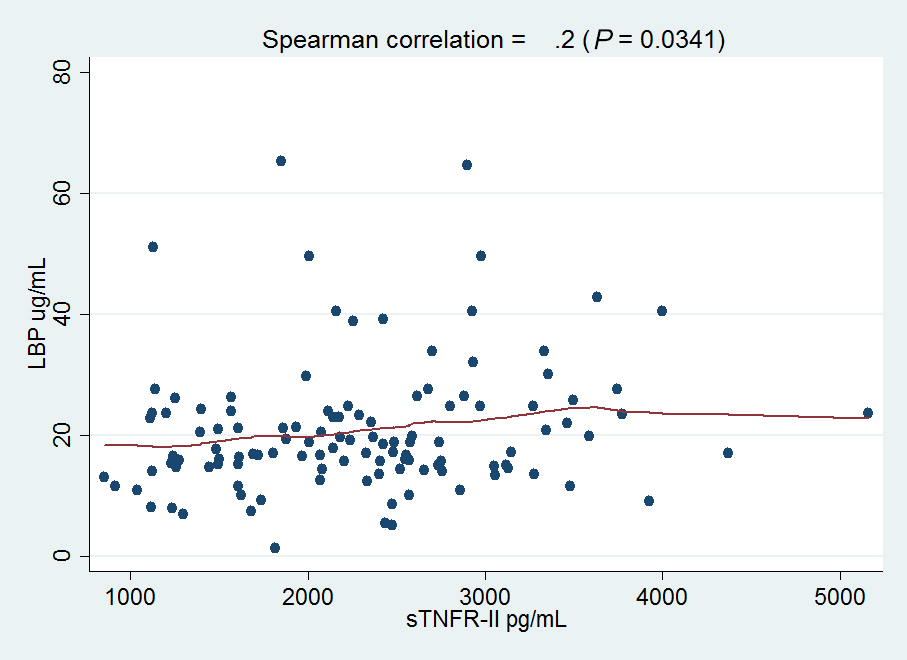 Whole blood samples were collected into EDTA-containing tubes. Plasma was isolated by centrifugation for 10 minutes at 400xg and was frozen at −80oC until thawed once and analyzed in batch. Plasma samples were collected at baseline, and at 24 and 48 weeks. Levels of zonulin-1 (ALPCO, Salem, NH), I-FABP (R&D Systems human FABP2 Duoset ELISA system: Minneapolis MN), and LBP (Hycult Biotech, Plymouth Meeting, PA) were measured by enzyme-linked immunosorbent assays (ELISA). Other plasma markers and cellular markers of immune activation were measured and have been described previously [8]. Levels of soluble CD14 and CD163 were measured using Quantikine enzyme-linked immunosorbant assay (ELISA) kits (R&D Systems, Minneapolis MN); levels of the proinflammatory cytokine IL-6 and soluble receptors of tumor necrosis factor α (sTNFR-I and sTNFR-II), interferon γ–inducible protein 10 (IP-10), the cellular adhesion molecules soluble vascular cell adhesion molecule 1 (sVCAM-1) and soluble intercellular adhesion molecule 1 (sICAM-1) were also measured by ELISAs (R&D Systems, Minneapolis, MN).