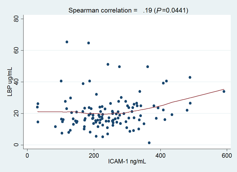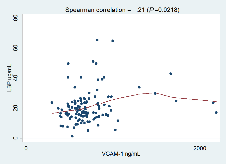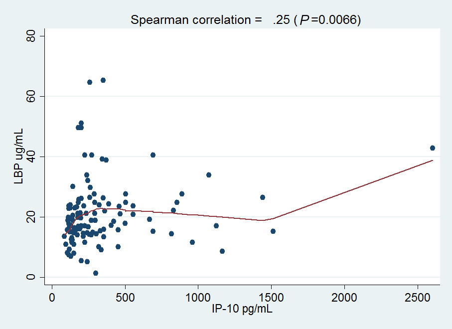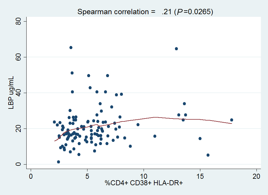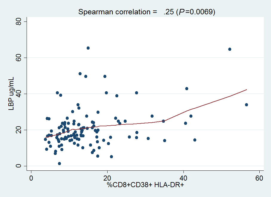 Figure 1. Plasma levels of lipopolysaccharide binding protein (LBP) are related to markers of immune activation in HIV-infected patients. Plasma samples were thawed and levels of (A) TNFr-II, (B) IP-10, (C) VCAM-1, (D) ICAM-1, and (E) sCD163 were measured by ELISA. Measurement of T-cell activation was performed by flow cytometry to assess surface activation markers (CD38, HLA-DR) on cryopreserved (F) CD4+ and (G) CD8+ T cells. Correlations between markers at baseline were determined using Spearman rank correlation, and lines were fitted to the data points using locally weighted regression (LOWESS).Rosuvastatin treatment was associated with reduced levels of I-FABP, when compared to placebo, during the 48-week treatment period (β = −1078.80 pg/mL, P = 0.04, Figure 2). As I-FABP levels decreased overtime in the statin arm, we eventually measured an inverse relationship between sCD163 and I-FABP (r = −0.21, P = 0.02) at week 48, but this relationship was driven by outliers within the data. Rosuvastatin treatment did not affect levels of LBP or zonulin, yet, a relationship between sCD163 and LBP was maintained at week 24, but became insignificant at week 48, likely due to the flat levels of LBP and a significant decrease in sCD163 at week 48 within the statin arm.