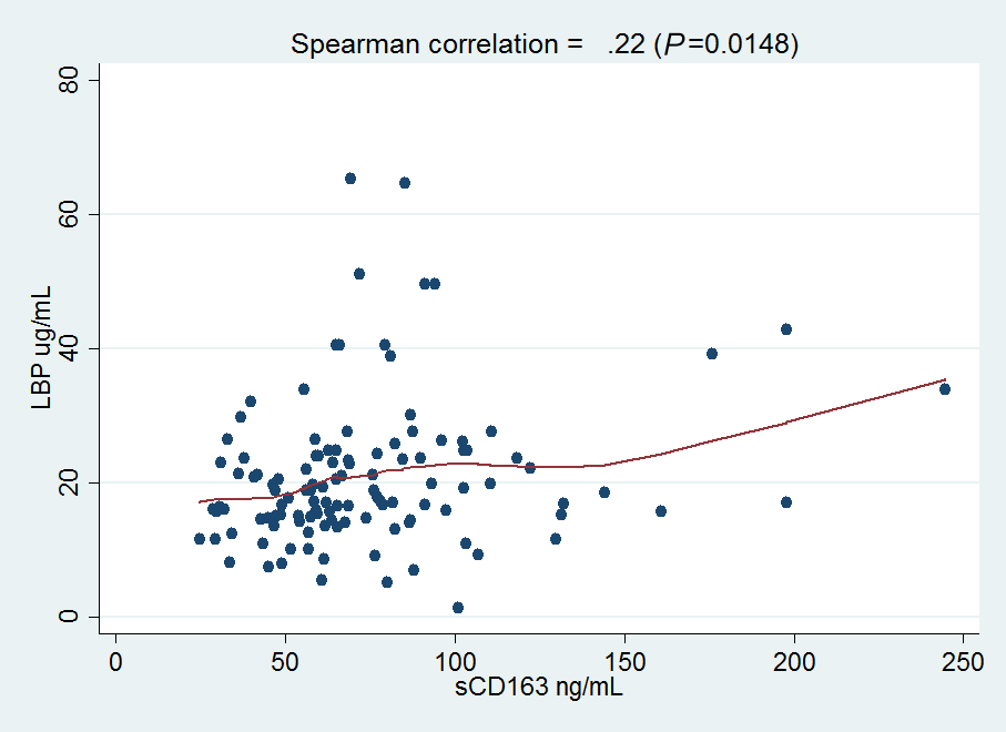 Levels of LBP, produced by hepatocytes in the liver, may reflect an attempt by the host to bind translocated LPS and clear it from the circulation [27]. Levels of LBP are increased in HIV-infected persons compared to uninfected controls [15] and LBP levels decrease following initiation of ART [28]. In our study, baseline levels of LBP were directly related to several markers of immune activation and inflammation (sCD163, CD38, and HLA-DR on T cells, among others) in all participants. Over 48 weeks of therapy, many inflammatory markers decreased with statin treatment [7-9], yet levels of LBP did not change significantly. Levels of sCD163 and LBP were directly related at week 24, but became insignificant at week 48, likely due to the flat levels of LBP and a significant decrease in sCD163 at week 48 within the statin arm. These baseline relationships did not persist over time, partially due to decreasing sample size (total population versus statin arm), but these results may also suggest that changes in microbial translocation and GI-function are not responsible for improvement in immune activation within these participants. This null result is made less surprising based on our recent findings that statin treatment reduces oxidized LDL (oxLDL) levels in these subjects [29 ], and that early changes in oxLDL levels were related to changes in soluble CD14 and intima-medial thickness of the carotid artery. This suggests that statin-mediated decreases in pro-inflammatory lipid profiles may be on the causal pathway for reduction in inflammation, monocyte activation, and cardiovascular disease in ART-treated HIV infection.
