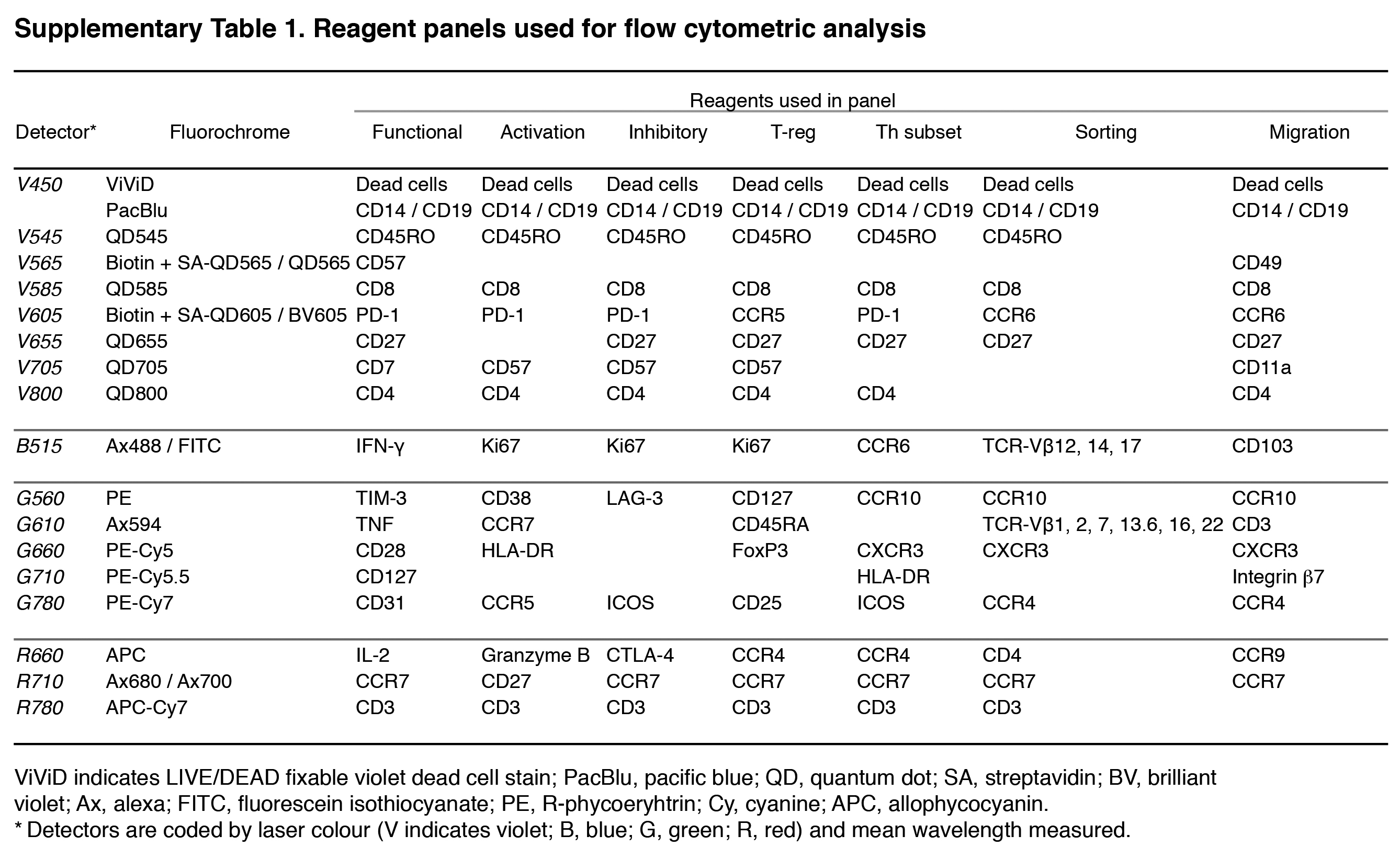 Flow cytometry.The reagent panels used in the present study are listed in Supplementary Table 1. All except the “Th subset” and “sorting” panels have been described in previous publications [17, 18]. The “Th subset” panel included the following additional reagents: CCR6Ax488 (clone TG7/CCR6); CCR10PE (clone 6588-5, both from BioLegend); CXCR3PE-Cy5 (clone 1C6/CXCR3); and HLA-DRPE-Cy5.5 (clone TÜ36, both from BD Biosciences). The “sorting” panel included the following additional reagents: CCR6BV605 (clone G034E3); CCR4PE-Cy7 (clone TG6/CCR4, both from BioLegend); CD4APC (clone RPA-T4, BD Biosciences); as well as TCR-Vβ12 (clone VER2.32.1); TCR-Vβ14 (clone CAS1.1.1.3); and TCR-Vβ17 (clone E17.5F3.15.13) conjugated to FITC (Life Technologies) at the VRC; and TCR-Vβ1 (clone BL37.2); TCR-Vβ2 (clone MPD2D5); TCR-Vβ7 (clone ZOE); TCR-Vβ13.6 (clone JU74.3); TCR-Vβ16 (clone TAMAYA1.2); and TCR-Vβ22 (clone IMMU546) conjugated to Ax594 (Life Technologies) at the VRC. All unconjugated TCR-Vβ Abs were obtained from Beckman Coulter. For intracellular staining, cells were treated with BD Cytofix/Cytoperm Permeabilization Solution (BD Biosciences), except for the Treg panel, where the Foxp3 Staining Buffer Set was employed (eBioscience). Data were acquired on an LSR II (BD Biosciences) using a high-throughput system (HTS).