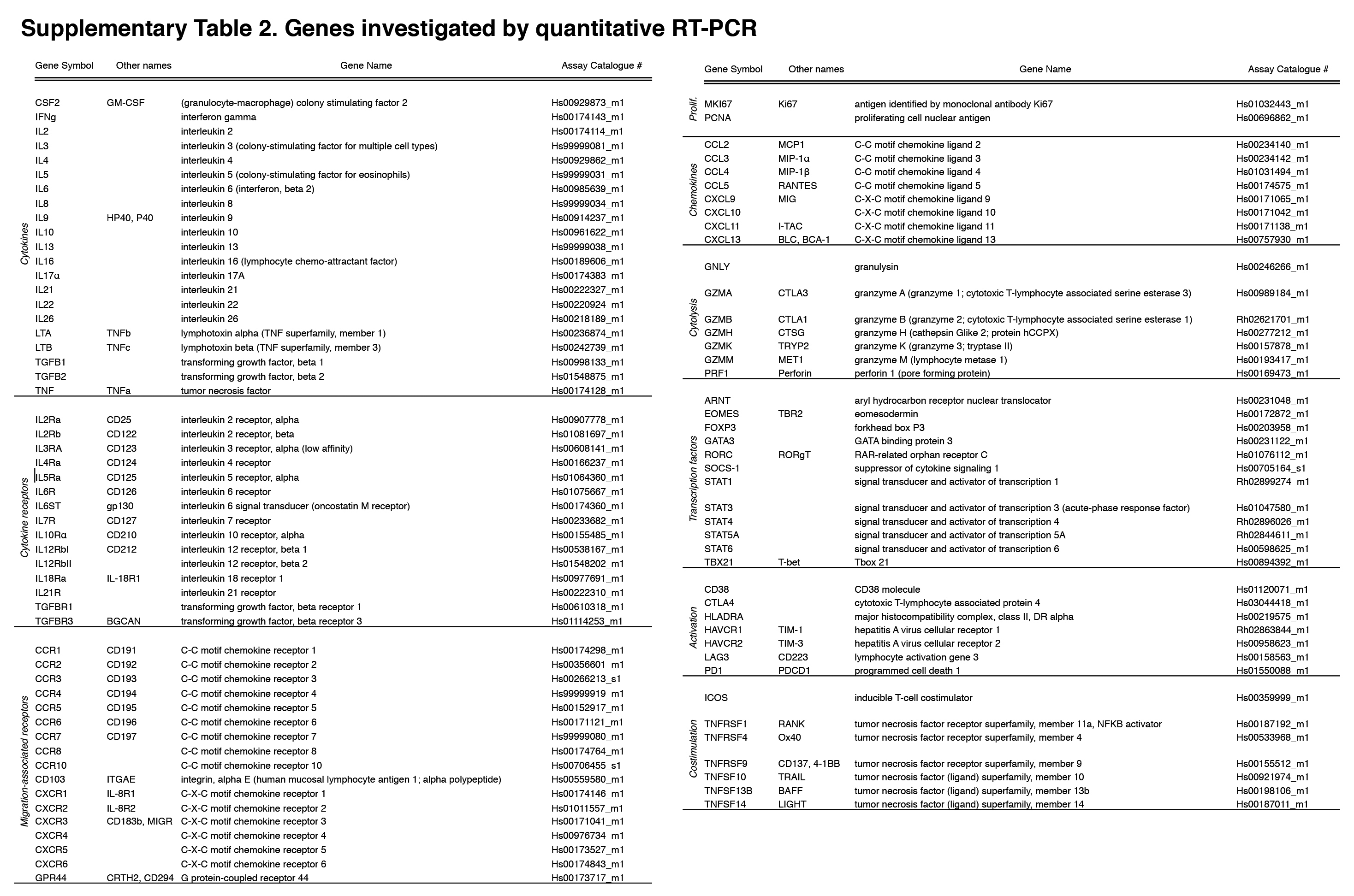 Multi-parametric quantitative RT-PCR. We largely followed the protocols set forth by Dominguez et al. [19]. Briefly, TaqManTM primer/probe sets (Life Technologies) were chosen for genes relevant for T-cell immunity, including those associated with cytokines, cytokine receptors, migration, proliferation, chemokines, cytolysis, transcription factors, activation, and costimulation (see Supplementary Table 2). Depending on subset abundance, 10-100 cells were sorted by fluorescence-activated cell sorting for assessment of gene expression in different CD4+ T-cell subsets (Supplementary Figure 5). Cells were sorted directly into cell culture plates containing 10µl of reaction mix (Invitrogen Cell Direct KitTM, Life Technologies); the manufacturer’s instructions were followed for reverse transcription (15min at 50°C) and cDNA synthesis (2min at 95°C; 15sec at 95°C; 4min at 60°C). Seventeen pre-amplification cycles were performed (15sec at 95°C; 4min 60°C).