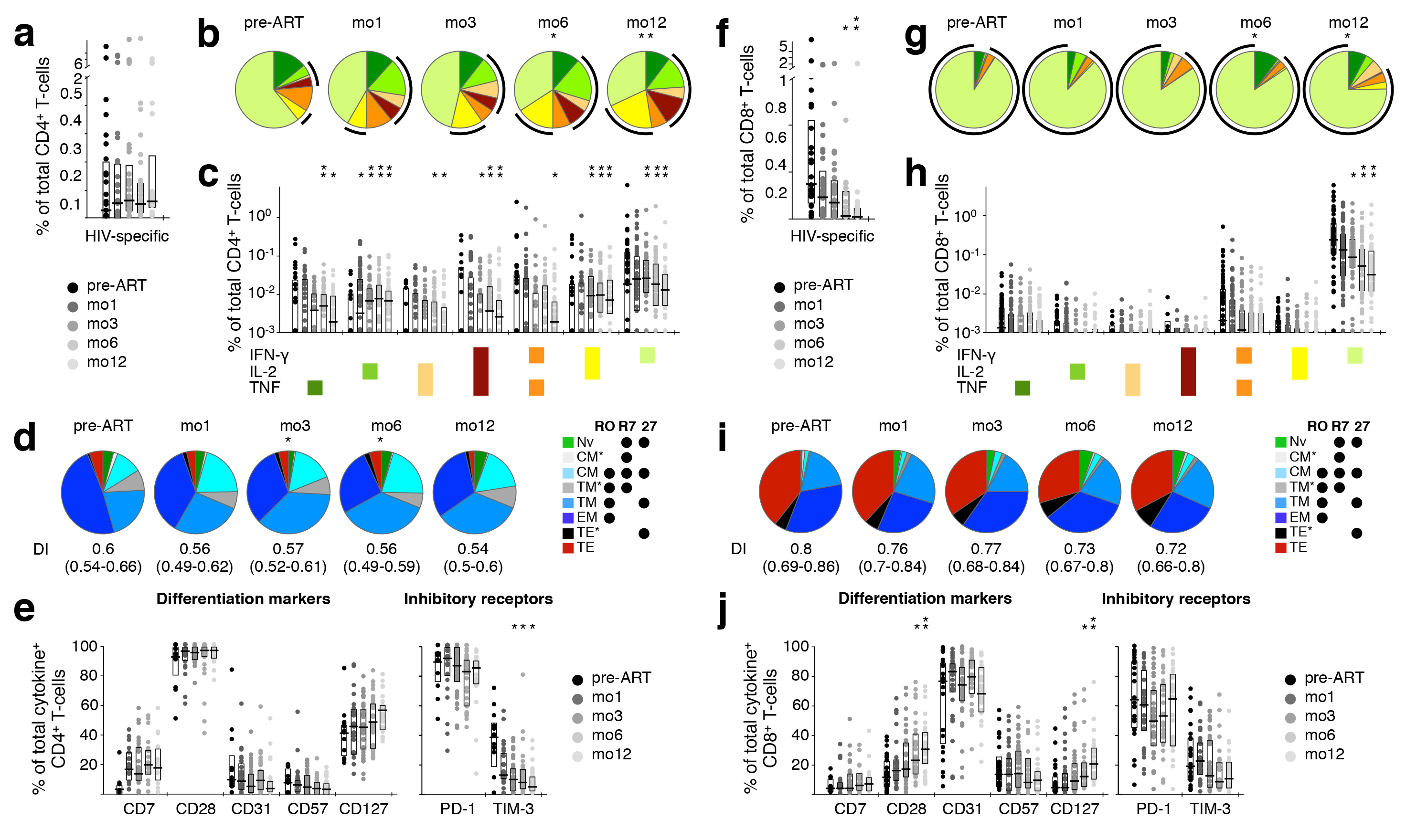 Figure 1. Longitudinal analysis of HIV-1 Gag-specific cytokine production by T cells and the phenotype of cytokine-producing cells. The effect of ART on HIV-1 Gag-reactive CD4+ (A-E) and CD8+ T cells (F-J) was determined in longitudinal PBMC samples of HIV-1+ patients. (A, F) Total response magnitude, measured by production of IFN-γ, IL-2, or TNF. (B, G) Cytokine pattern. Relative proportion of total HIV-1 Gag-reactive cells producing each possible combination of the cytokines measured. Black arcs indicate all IL-2 (B) or IFN-γ (G) producing cells. (C, H) Actual frequency of cells producing only IFN-γ, IL-2, or TNF, or any combination thereof. Potential phenotypic alterations occurring due to ART were explored in HIV-1 Gag-reactive CD4+ (D, E) and CD8+ T cells (I, J) in longitudinal PBMC samples of HIV-1+ patients. (D, I) Differentiation state. T-cell differentiation subsets of cytokine-positive cells were defined by expression of CD45RO (“RO”), CCR7 (“R7”), and CD27 (“27”). Differentiation indices (DI; medians and interquartile ranges) are indicated below each pie. (E, J) Phenotype. The frequency of cytokine-positive cells expressing differentiation markers (CD7, CD28, CD31, CD57, CD127) or inhibitory receptors (PD-1, TIM-3) was determined. Graphs show interquartile ranges, median bars, as well as individual data points. All time-points were compared to corresponding pre-ART measurements: *P <0.01, **P <0.001, *** P <0.0001.