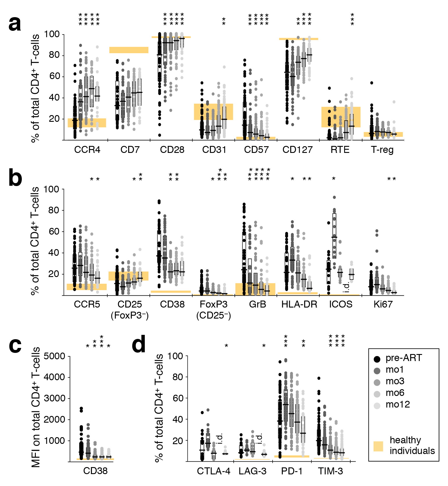 Figure 3. Reversal of CD4+ and T-cell activation during ART. Phenotypic characteristics of CD4+ T cells were analyzed by polychromatic flow cytometry in PBMC sampled before ART, as well as after 1, 3, 6, and 12 months of ART. (A) T-cell differentiation and subtypes; RTE–recent thymic emigrants. (B) Markers of activation; GrB–Granzyme B. (C) Mean fluorescence intensity of CD38. (D) Inhibitory receptors. Graphs show interquartile ranges, median bars, as well as individual data points. Orange areas represent the interquartile ranges of corresponding measurements in healthy individuals. All time-points were compared to corresponding pre-ART measurements: *P < 0.01, **P < 0.001, ***P < 0.0001. i.d.–insufficient data.