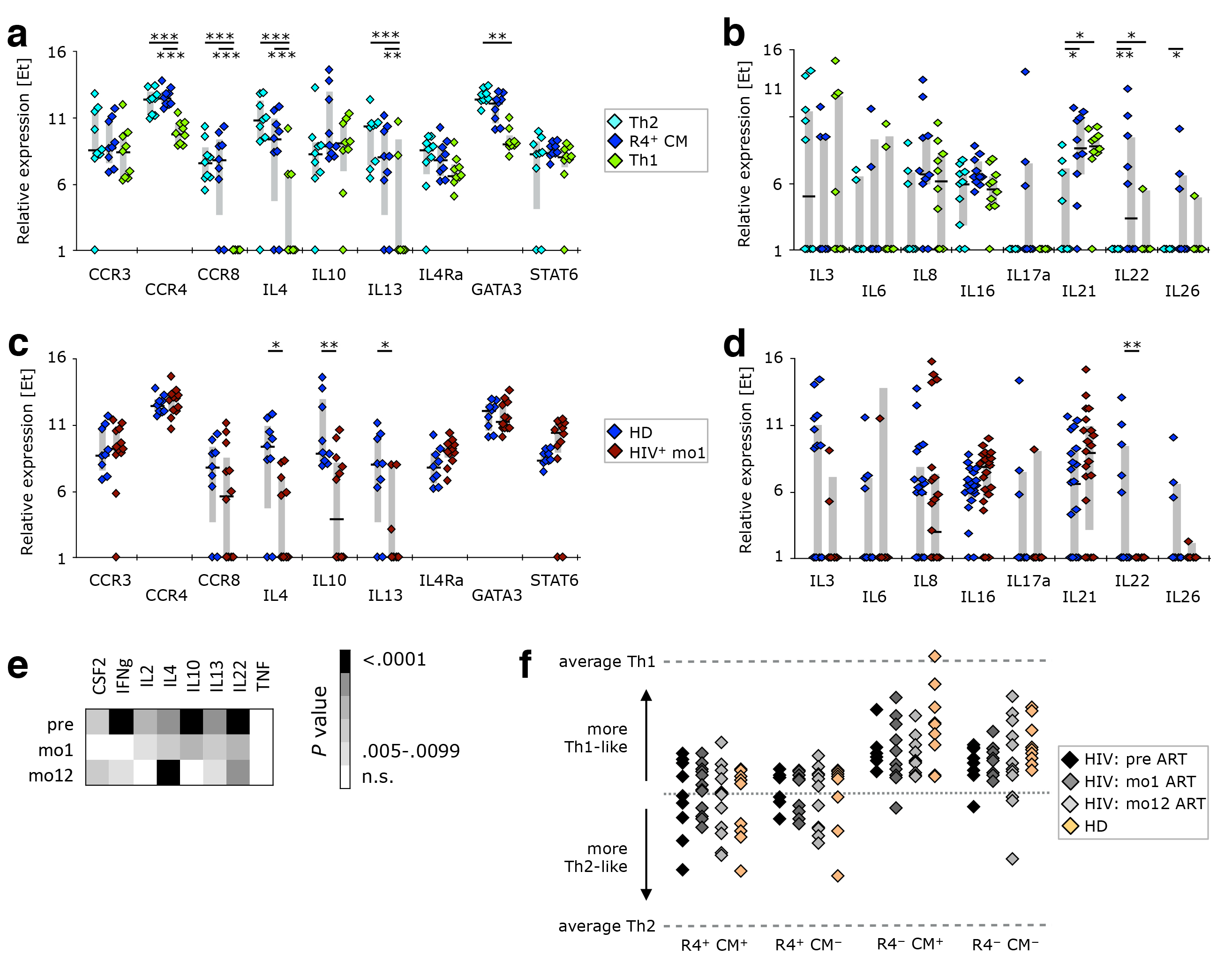 For the elucidation of T-helper subsets (Figures 5-6), PBMC of an additional 13 HIV-1+ individuals were sampled before, as well as 1 month, and 12 months after initiation of ART. Their clinical parameters were comparable to that of the main cohort, with the following medians and inter-quartile ranges pre-ART: 56 (20-77) CD4+ T cells/μl, 572 (469-744) CD8+ T cells/μl, 4.8 (4.5-5.4) log10 PVL; after 1 month of ART: 129 (101-152) CD4+ T cells/μl, 918 (589-1105) CD8+ T cells/μl, 2.3 (1.9-2.7) log10 PVL; and after 12 month of ART: 210 (199.8-264.5) CD4+ T cells/μl, 795.5 (555.5-950) CD8+ T cells/μl, 1.7 (1.7-1.7) log10 PVL. None of these patients experienced IRIS. PBMC from an additional 16 healthy donors served as controls for this part of the study.