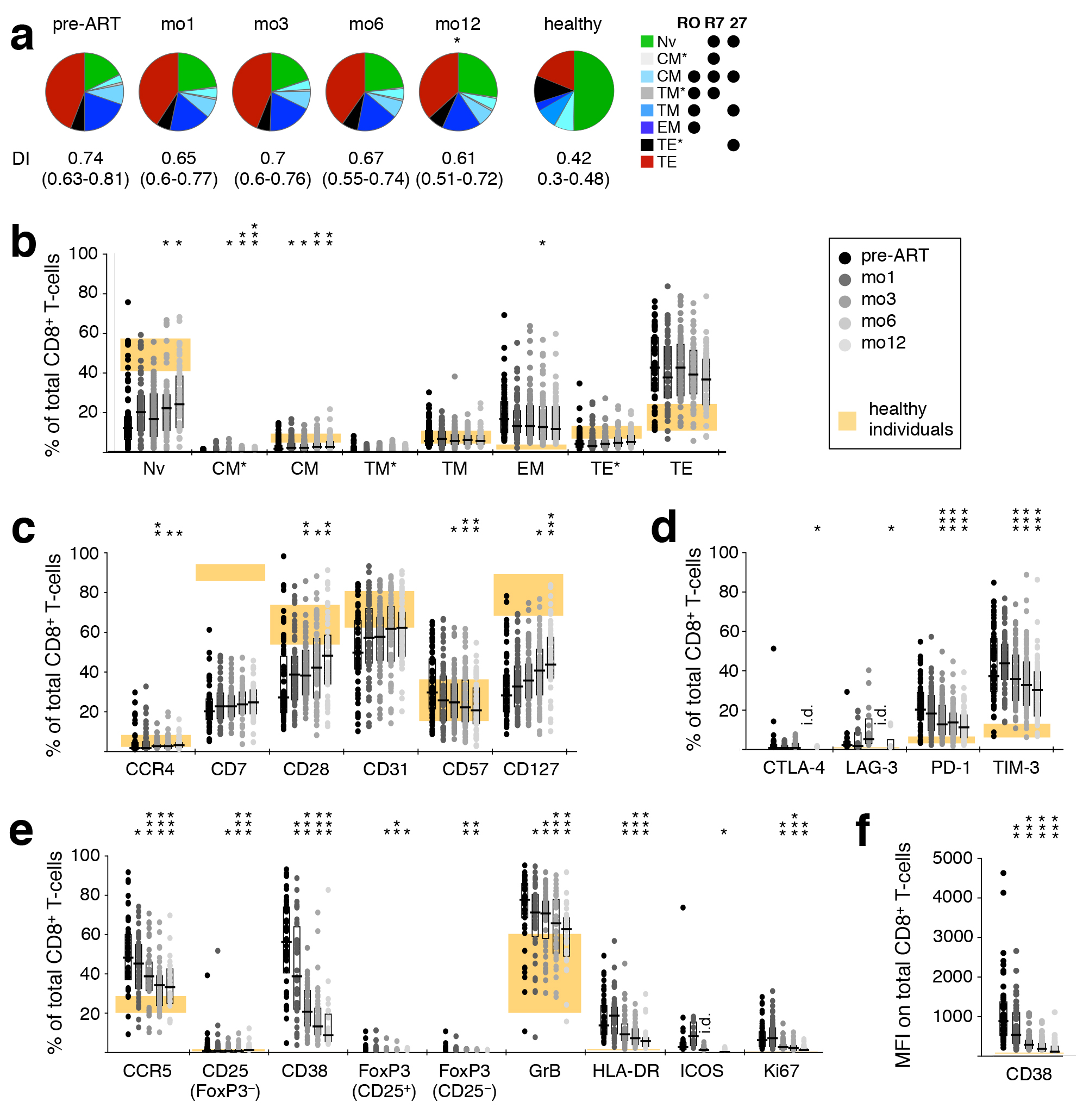 Supplementary Figure 2. ART-induced change towards less differentiated CD8+ T-cells. PBMC were sampled before, as well as after 1, 3, 6, and 12 months of ART. The distribution of differentiation stages (A) and frequency of individual differentiation subsets (B) was investigated in CD8+ T-cells. T-cell differentiation subsets were defined by expression of CD45RO (“RO”), CCR7 (“R7”) and CD27 (“27”). Differentiation indices (DI; medians and interquartile ranges) are indicated next to each pie. The average T-cell differentiation profile as well as the interquartile range of the differentiation indices in healthy donors are shown. (C) Markers of Tcell differentiation. (D) Inhibitory receptors. (E) Markers of activation; GrB – Granzyme B. (F) Mean fluorescence intensity of CD38. Graphs show interquartile ranges, median bars, as well as individual data points. Orange areas represent the interquartile ranges of corresponding measurements in healthy individuals. All timepoints were compared to corresponding pre-ART measurements: * P < 0.01, ** P < 0.001, *** P < 0.0001.