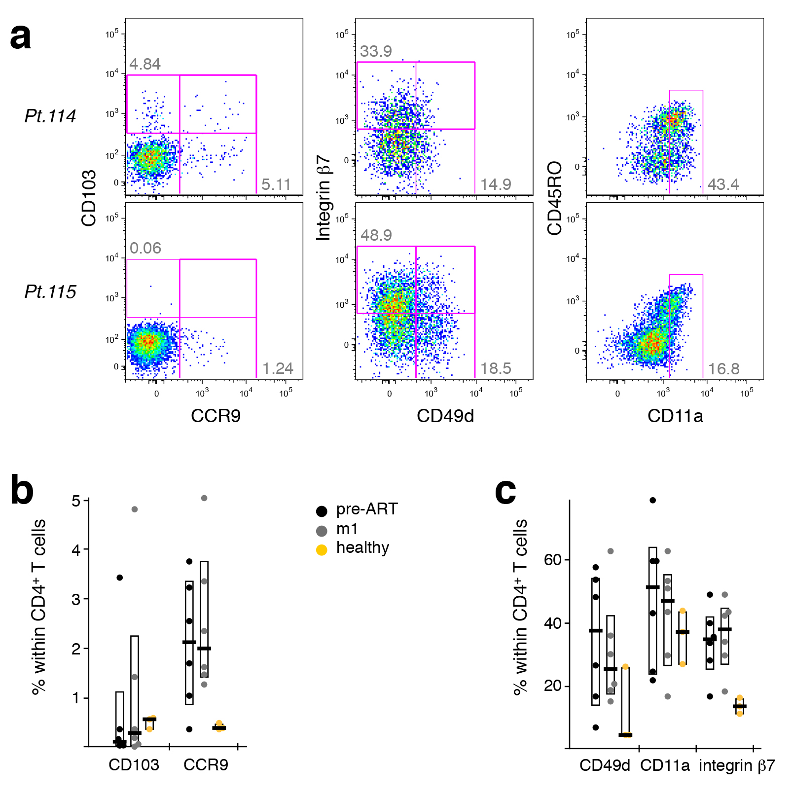 We investigated the cell surface expression of several migration molecules on CD4+ T cells and found varied expression patterns between patients. HIV-1 patients appeared to have somewhat lower levels of CD103+ cells than healthy donors, while exhibiting higher levels of CCR9+ and integrin b7+ cells (Supplementary Figure 6). This was the case both pre-treatment and after 1 month of ART. Within CD4+ T cells, CD103 seemed to be preferentially expressed on CCR4+ cells.
