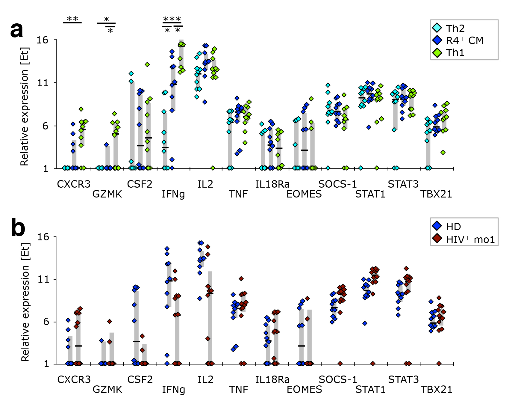 Supplementary Figure 5. CCR4+ TCM resemble Th2-like cells in respect to their expression of Th1 associated genes. PBMC from healthy donors, as well as cells isolated before or after 1 or 12 months of ART from HIV-1-infected adults were stained with the “sorting” panel (Supplementary Table 1). Subsets of CD4+ T-cells were sorted as indicated in Supplementary Figure 4 and their gene expression profiles determined by multi-parametric quantitative RT-PCR. (A) Th1-associated genes were compared in Th2-like, CCR4+ TCM, and Th1-like cells isolated from healthy donors. (B) CCR4+ TCM from HIV-1+ patients after 1 month of ART were compared to their counterparts from healthy donors in respect to expression of Th1-associated genes. Bar graphs show interquartile ranges, median bars, as well as individual data points. Statistically significant differences are indicated: * P < 0.01, ** P < 0.001, *** P < 0.0001.
