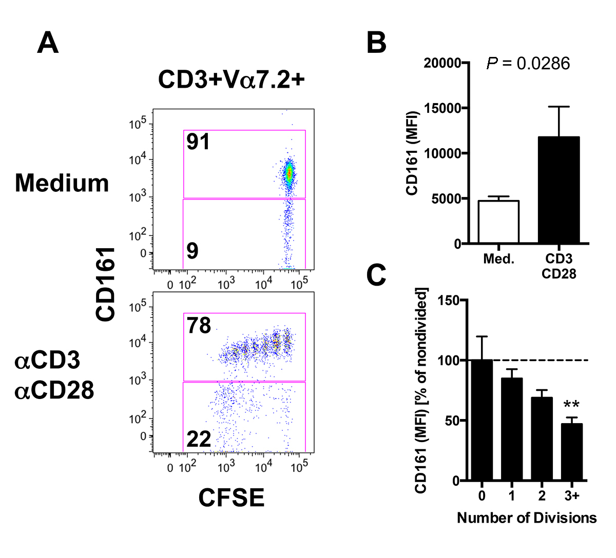 anti-CD28, then measured cell division and CD161 expression on CD3+V