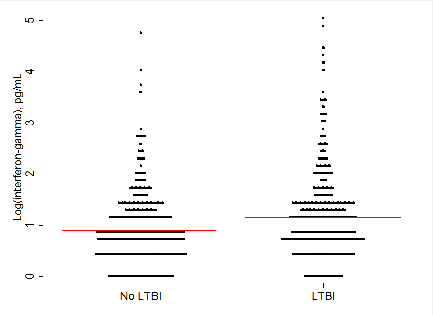 Figure 1. Interferon-gamma concentrations by latent tuberculosis infection (LTBI) status. The median is indicated with the red lines.