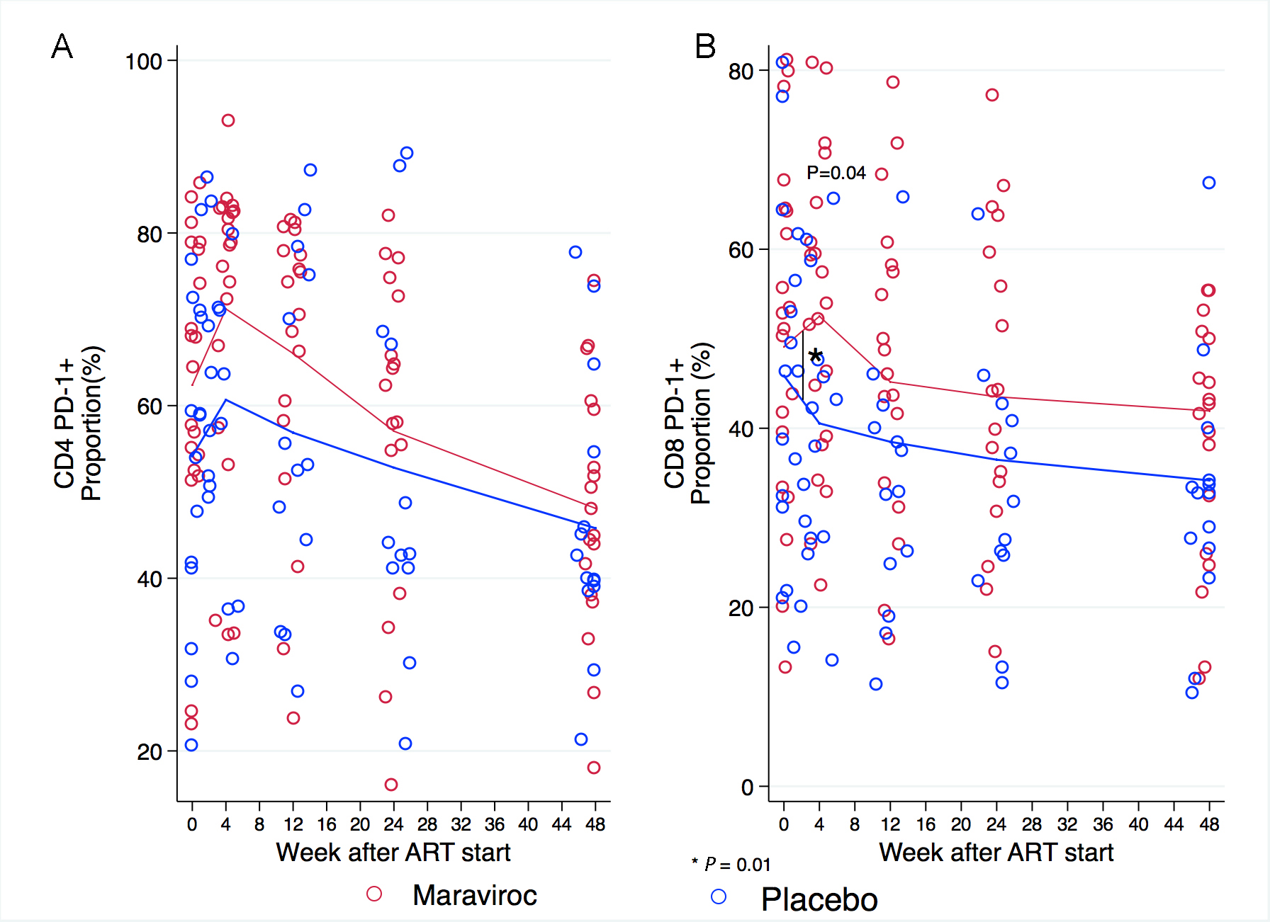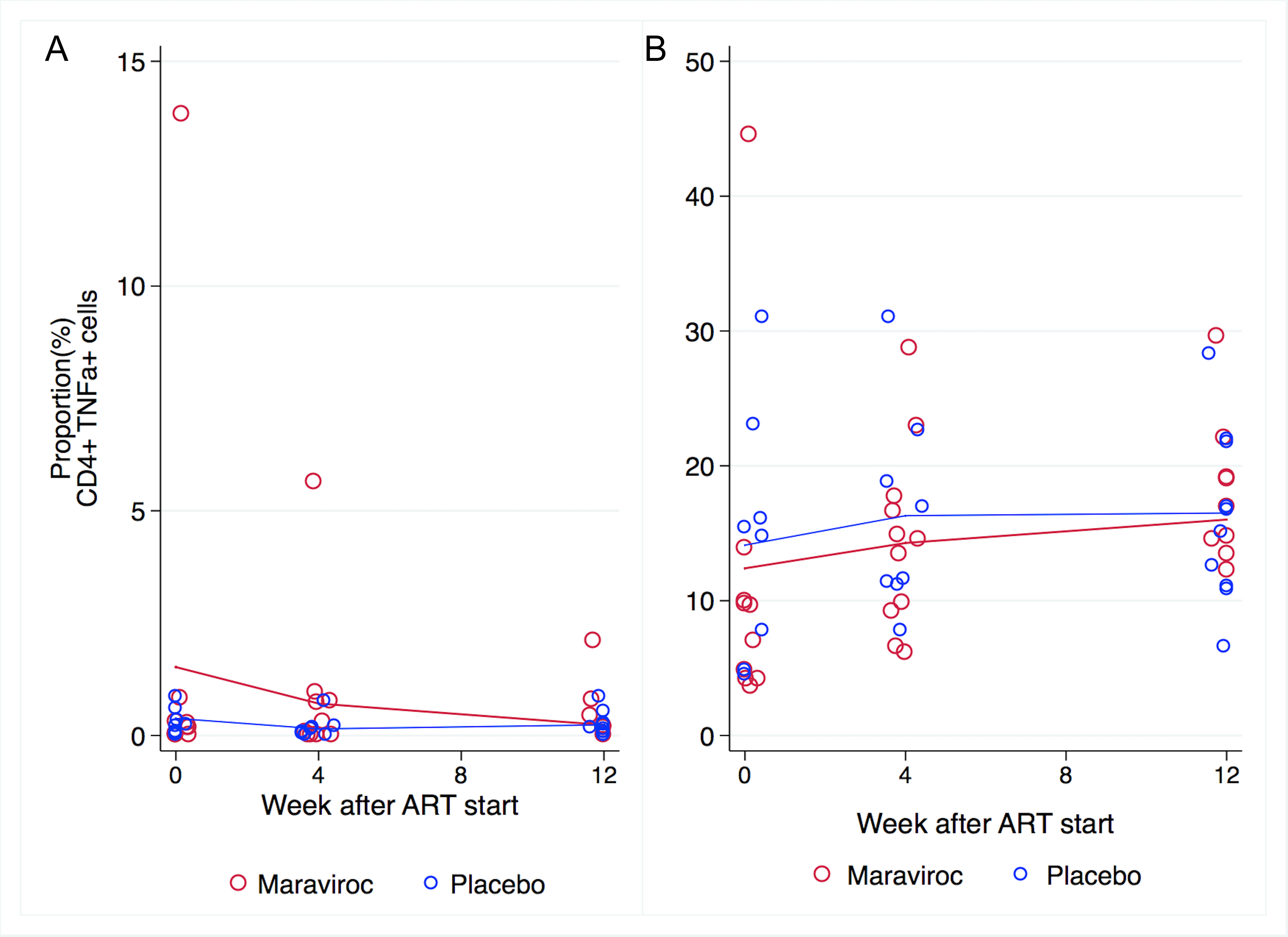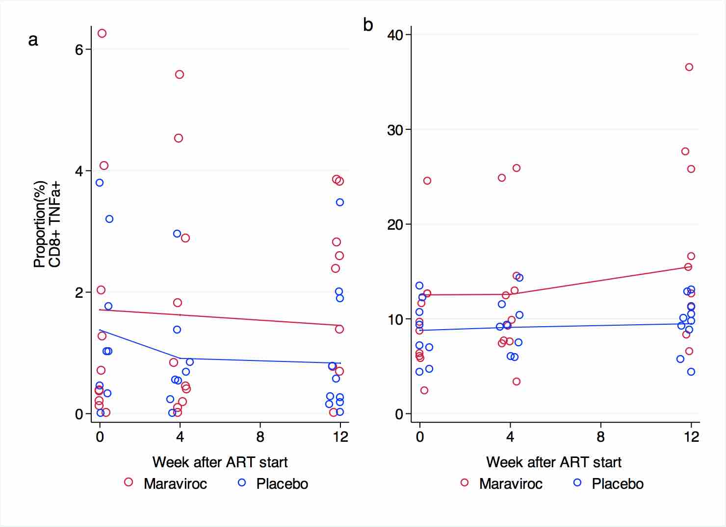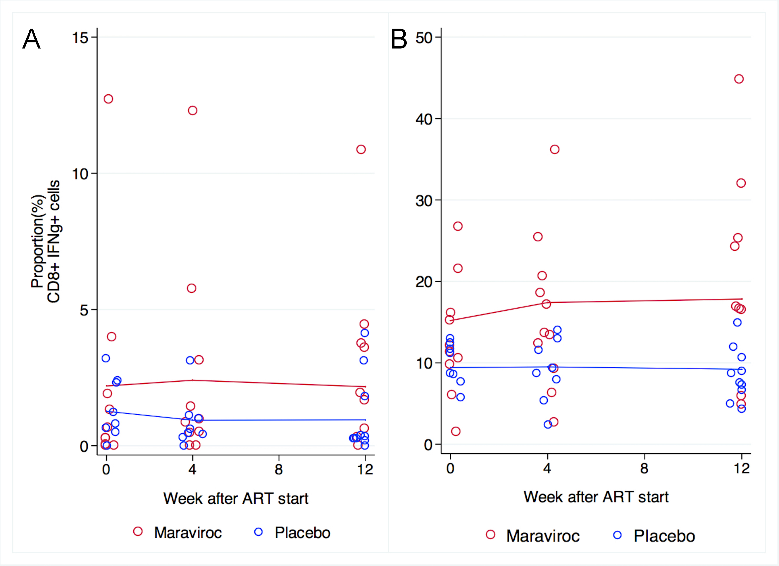 Results: Forty patients were included in the study (Maraviroc = 22; placebo = 18). Sustained increases in CD8+ cells and in proportions of CCR5+ CD4+ and CD8+ cells were observed in the maraviroc arm.. Early increases in the proportions of activated (CD38+, HLA-DR+), PD-1+ CD4+, and CD8+ cells and more matured CD8+ cells, were observed in the maraviroc arm. T cell responses to CMV, MTb and SEB did not differ by treatment arms.