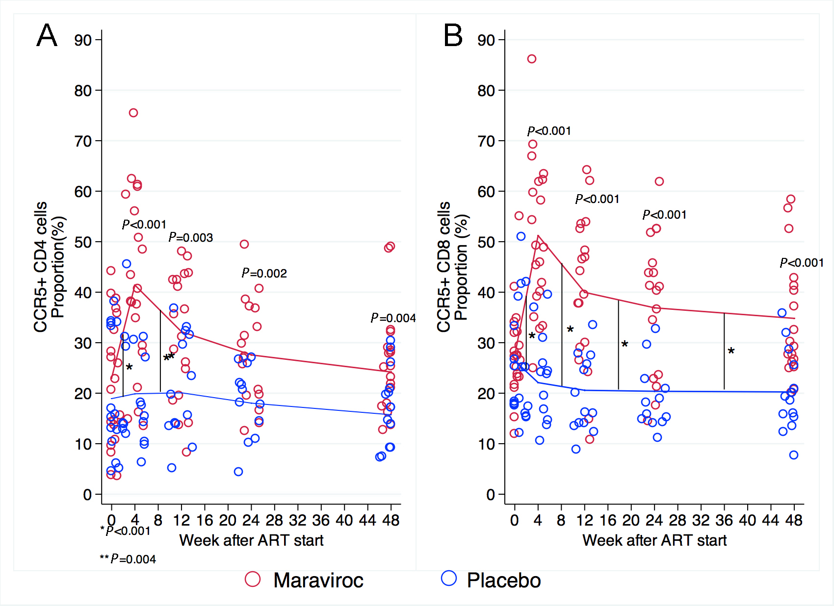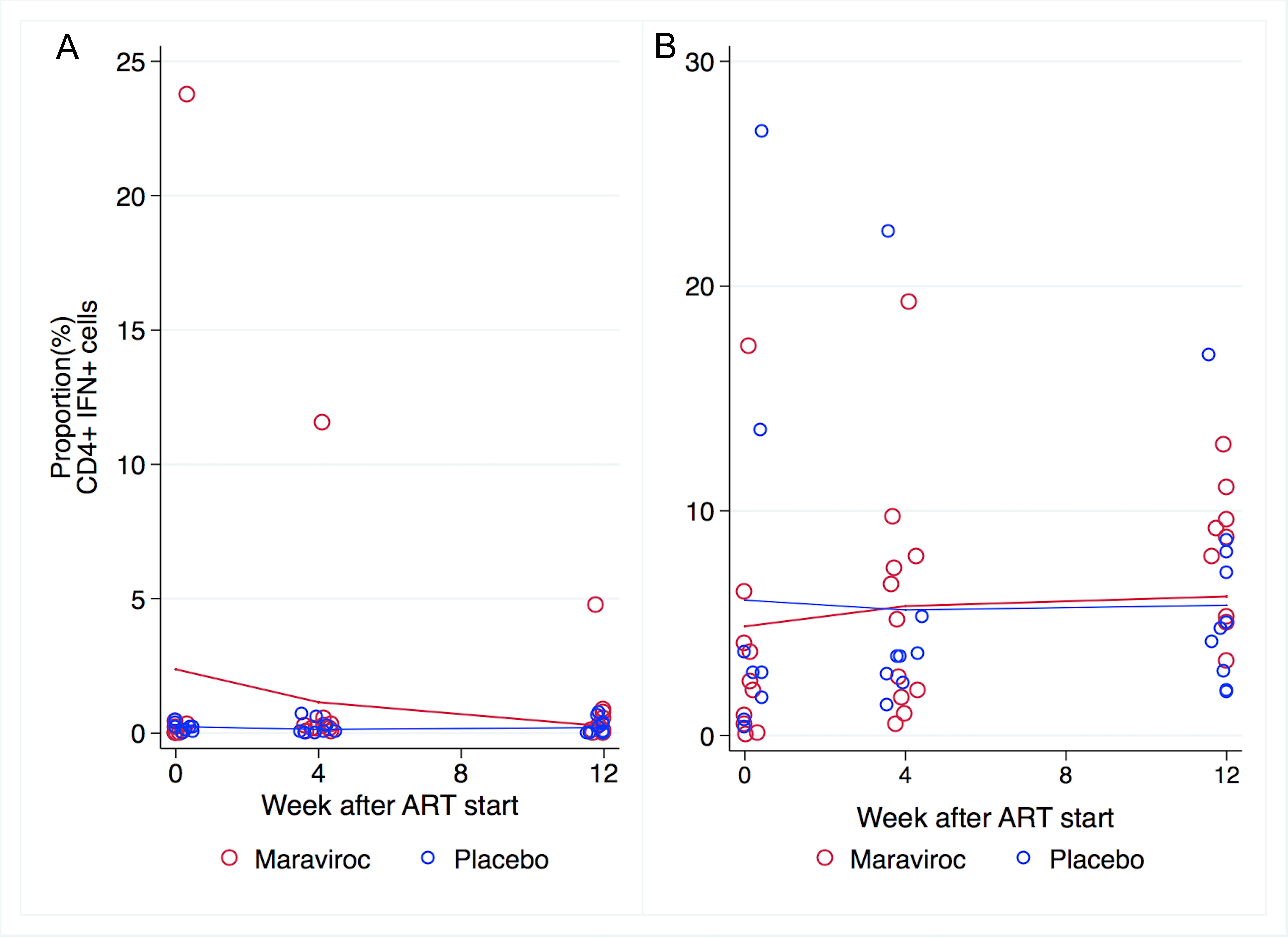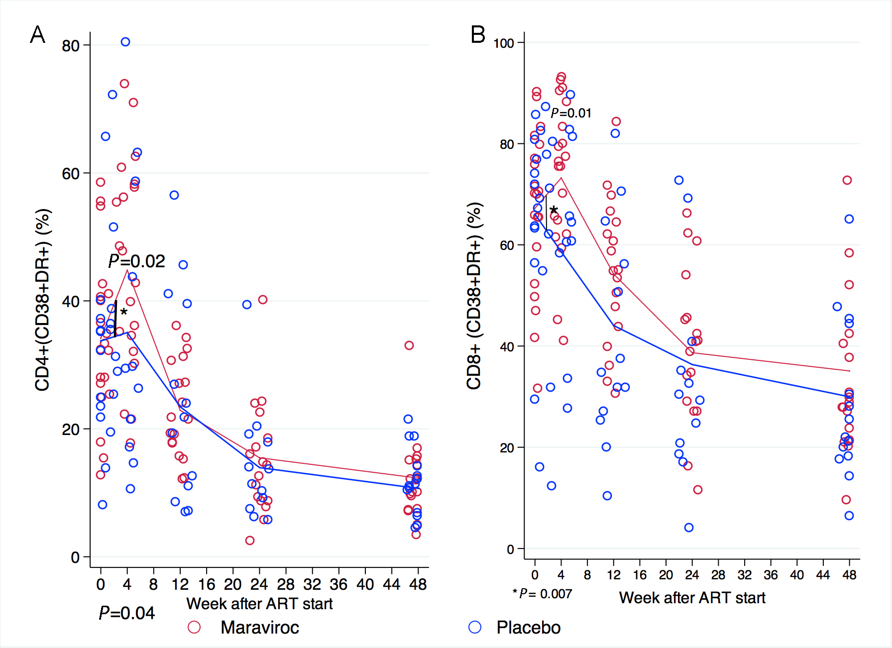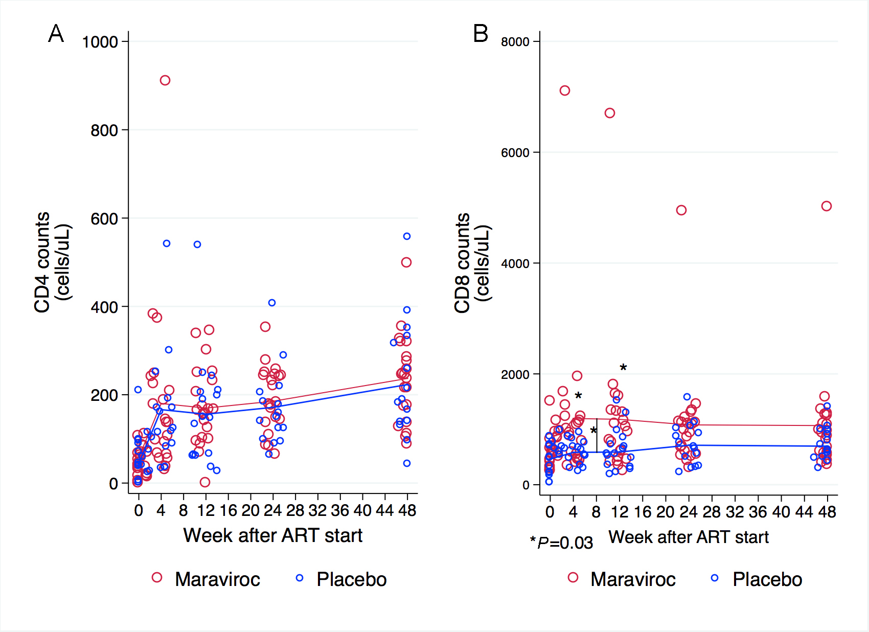 Results: Forty patients were included in the study (Maraviroc = 22; placebo = 18). Sustained increases in CD8+ cells and in proportions of CCR5+ CD4+ and CD8+ cells were observed in the maraviroc arm.. Early increases in the proportions of activated (CD38+, HLA-DR+), PD-1+ CD4+, and CD8+ cells and more matured CD8+ cells, were observed in the maraviroc arm. T cell responses to CMV, MTb and SEB did not differ by treatment arms.
