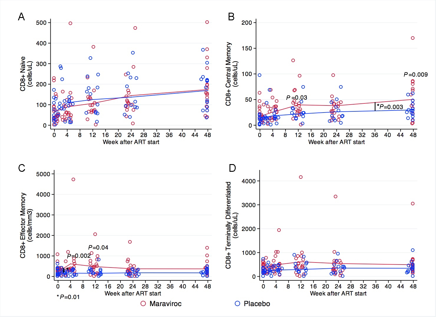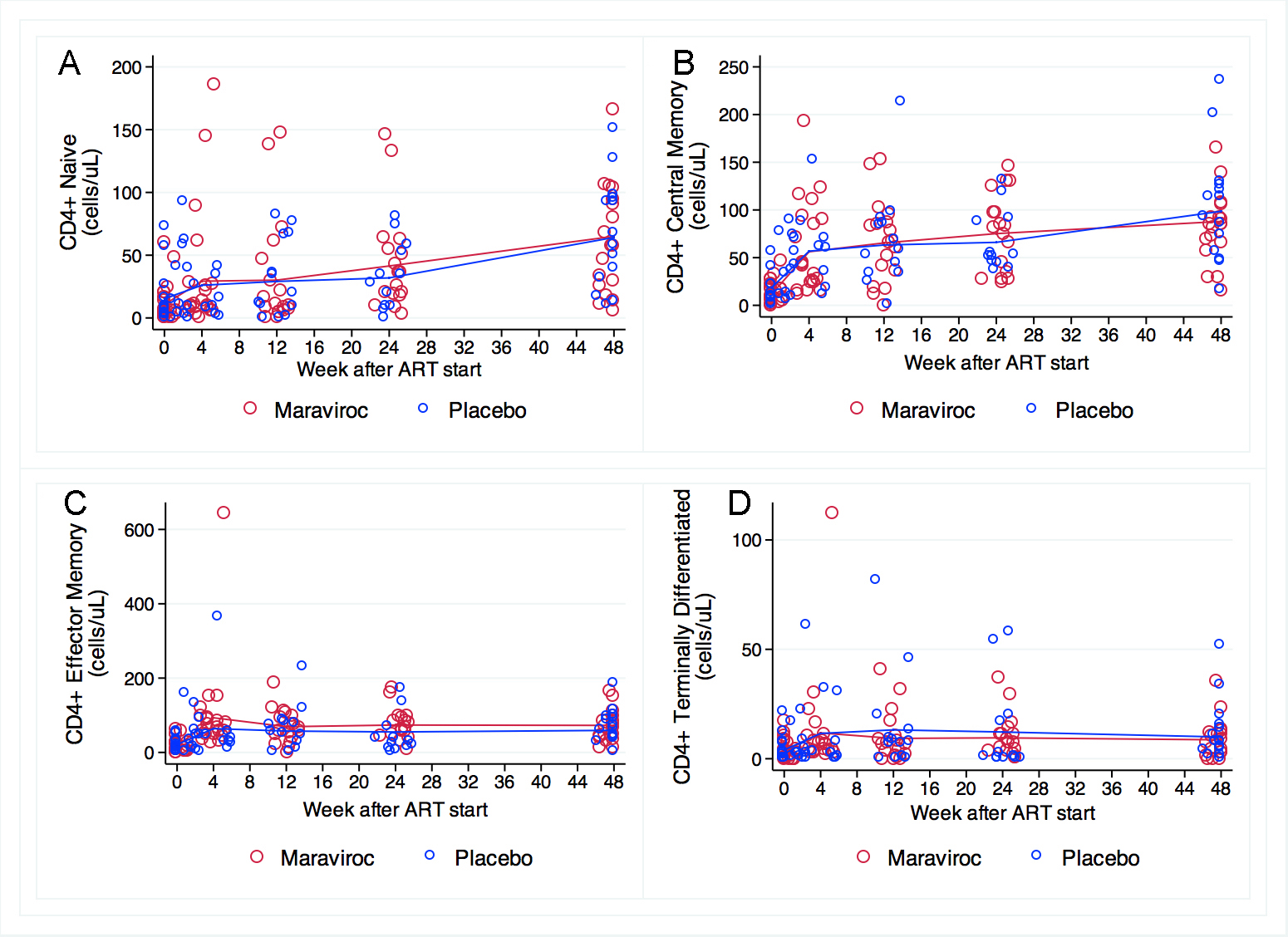 We had the opportunity to examine the effects of ART or ART plus maraviroc on the restoration of T- cell maturation subsets. Among circulating CD4+ cells, subsets of naive, central memory, effector memory, and terminally differentiated cells rose in parallel in the 2 treatment groups. Among ART plus placebo recipients, absolute numbers of CD8+ cells remained stable over the 48-week course of treatment. In contrast, administration of ART plus maraviroc resulted in an early, significant increase in absolute numbers of CD8+ cells that were higher than among ART-alone recipients at weeks 4 and 12. It is not surprising that absolute numbers of more differentiated CD8+ cells (central memory and effector memory) were greater during these early periods among maraviroc recipients as these more mature CD8+ cells are often CCR5+ and thus appear to be retained in circulation. The clinical relevance of this increase is uncertain, and this increase in mature presumably antigen-experienced cells was not reflected in an increase in the inducible expression of inflammatory cytokines by CMV or MTb peptides.