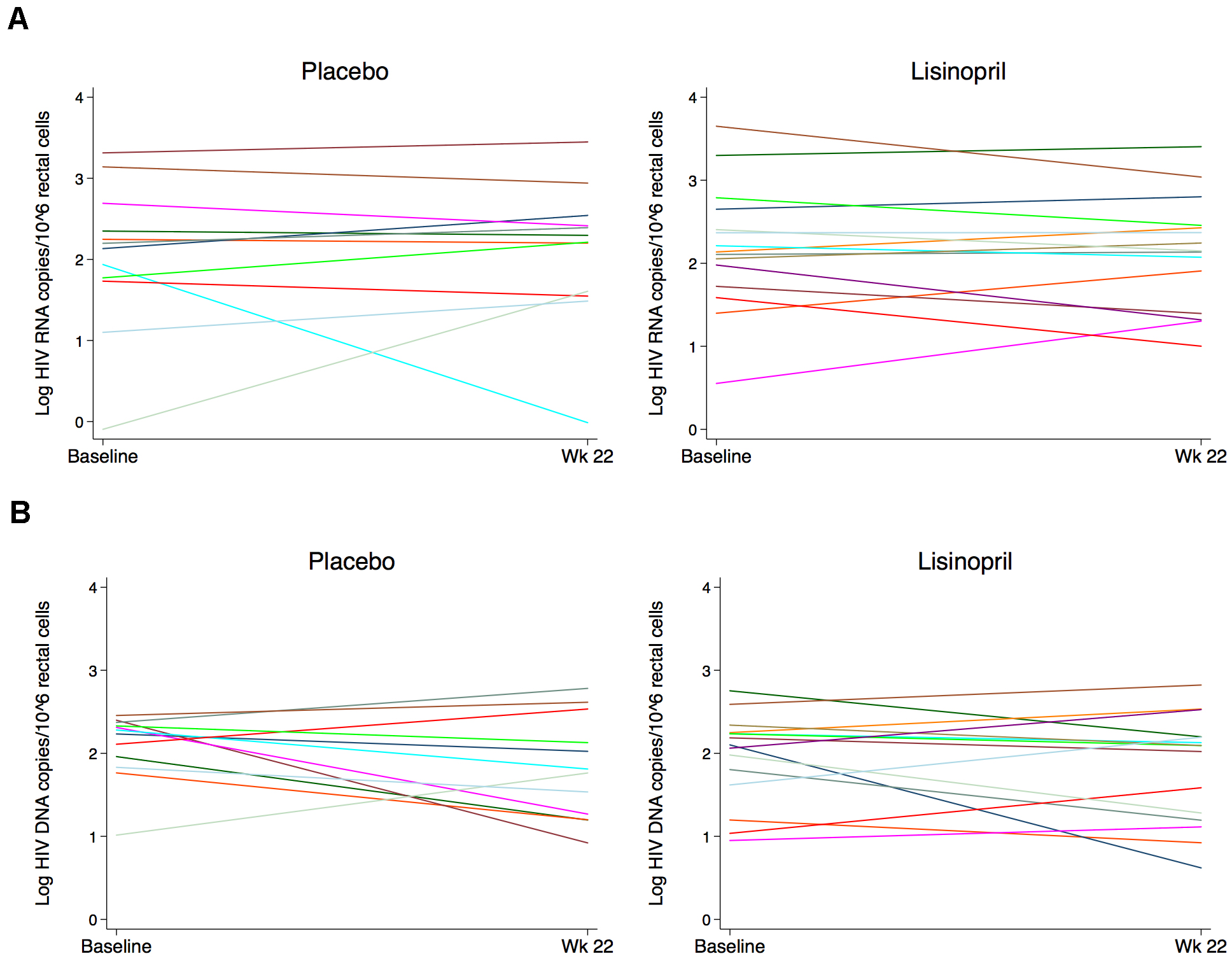 Methods: Thirty HIV-infected individuals on ART were randomized to lisinopril at 20mg daily or matching placebo for 24 weeks. All participants underwent rectal biopsies prior to starting the study drug and at 22 weeks, and there were regular blood draws. The primary end point was the change in HIV RNA and DNA levels in rectal tissue. Secondary outcomes included the change in 1) HIV levels in blood; 2) Gag-specific T-cell responses; 3) levels of T-cell activation; and 4) collagen deposition.