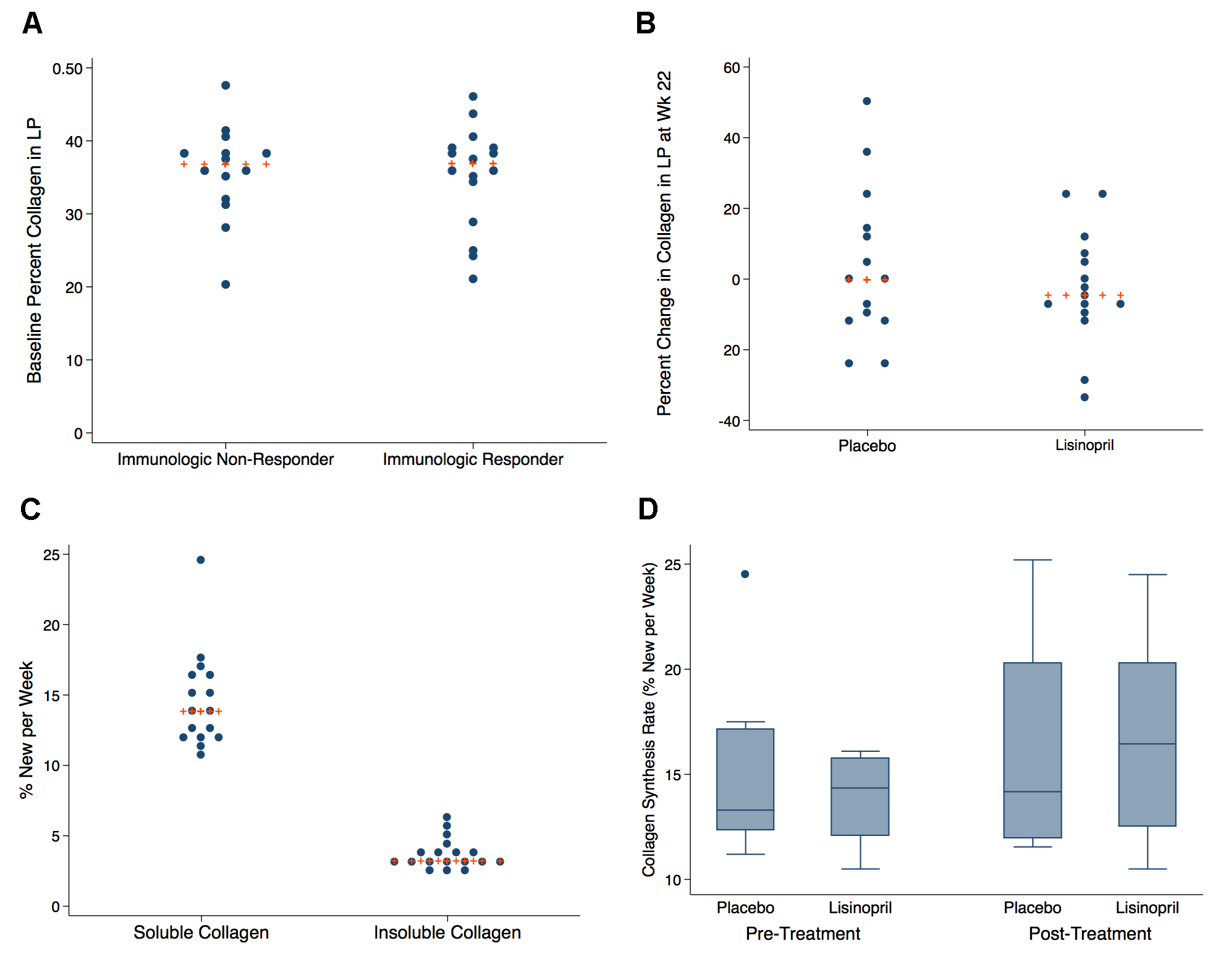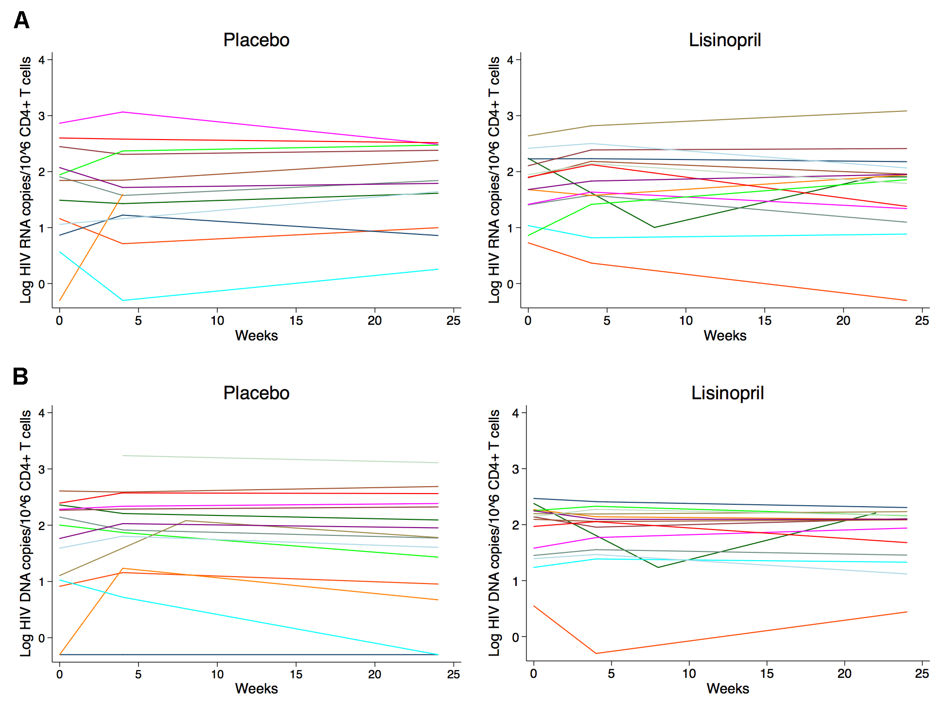 Secondary outcomes included the change in 1) HIV RNA and DNA levels in PBMCs; 2) CD4+ and CD8+ total Gag-specific responses (IFN-γ, IL-2, TNF-α, or CD107a) in rectal tissue and PBMCs; 3) the percentage of CD38+HLA-DR+ CD4+ and CD8+ T cells in rectal tissue and PBMCs; and 4) the rates of collagen turnover and amount of collagen deposition in rectal tissue. Levels were compared using the Wilcoxon rank sum test or the Wilcoxon signed rank test for paired samples. Linear mixed effects models with random intercepts and slopes were used to evaluate the association of the treatment group and responder status with the rates of change in HIV RNA and DNA levels in PBMCs, as well as T-cell activation and biomarker levels in PBMCs. Interaction terms between treatment group and time were used to determine whether the rate of change in these markers differed between the lisinopril-treated and placebo groups. All statistical analyses were performed using STATA/SE 12 (Stata Corp, College Station, TX).