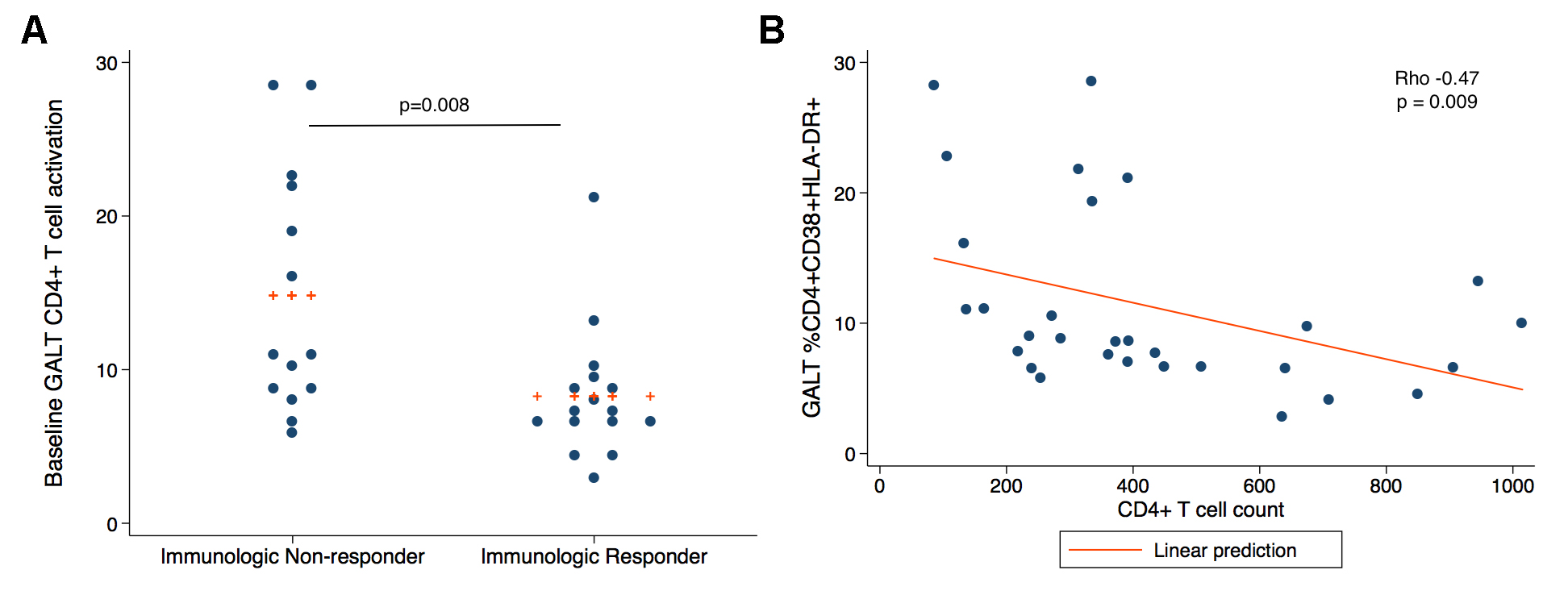 There was no difference in the percentage of CD38+DR+ CD4+ and CD8+ T cells between treatment groups at baseline. However, INRs had elevated median levels of CD38+ HLA-DR+ CD4+ and CD8+ T cells in rectal cells at baseline compared to IRs (CD4: median 11.1% vs 7.23%, P = 0.008, CD8: 24.0% vs 18.4%, P = 0.09) (Figure 3A) and this correlated negatively with the peripheral CD4+ T cell count (rho = -0.47, P = 0.009) (Figure 3B). The T-cell activation in PBMCs at baseline was also negatively correlated with peripheral CD4+ T cell count (% CD4+CD38+ HLA-DR+, rho -0.57, P = 0.001; % CD4+PD-1+, rho = -0.66, P = 0.0001), as has been seen previously in other studies 43]. The addition of lisinopril did not have a significant effect on the change in CD4+ and CD8+ T- cell activation or Gag-specific responses over time (data not shown).