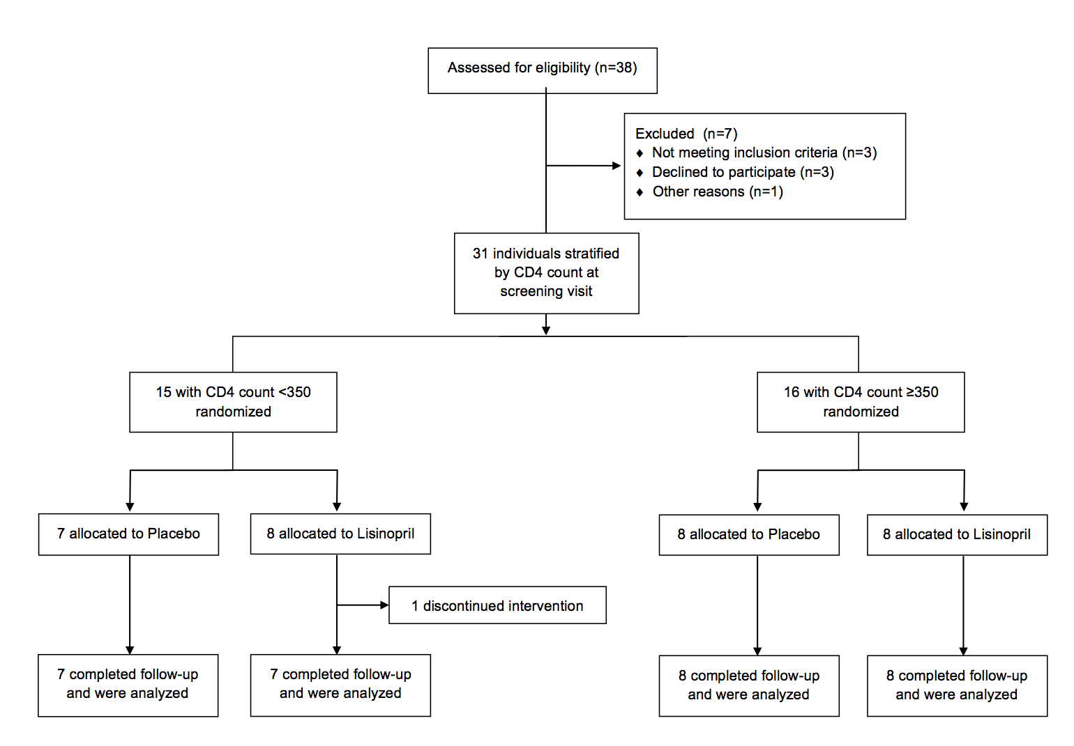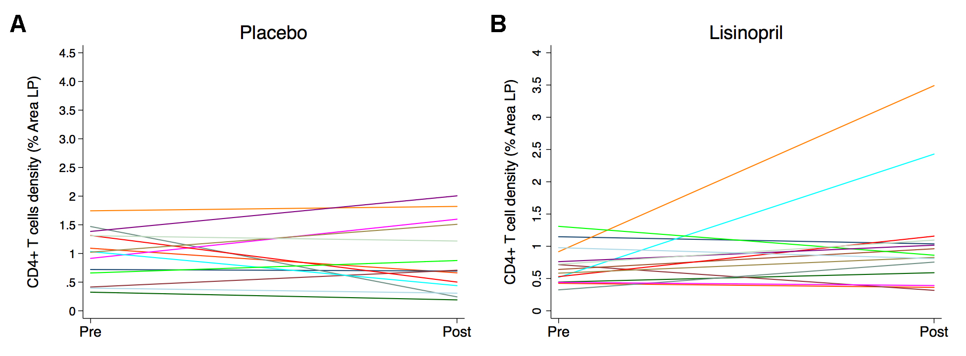 Thirty-one HIV-infected individuals on suppressive ART (HIV VL < 40-75 copies/mL) for ≥ 1 year were enrolled in this randomized, placebo-controlled study (clinical trials registration NCT01535235). Enrollment was stratified by CD4+ T-cell counts of < 350 cells/μL (immunologic non-responders, INRs) and ≥ 350 cells/μL (immunologic responders, IRs) (see Consort diagram in supplementary materials). Exclusion criteria included a known history of diabetes mellitus, cardiovascular disease, or collagen vascular disease. Individuals with a serum creatinine of > 1.5 mg/dL or who were already taking an ACE-inhibitor or angiotensin receptor blocker were also excluded. Study personnel and all authors were masked to the study group assignment until data collection and analyses were completed. Adherence to the study drug was measured at study visits by self-report and by pill count. All participants underwent sigmoidoscopy with rectal biopsies prior to starting the study drug and at 22 weeks, and there were frequent blood draws. All participants provided written informed consent. This study was approved by the University of California, San Francisco (UCSF) Committee on Human Research. An independent Data Monitoring Committee comprising 3 independent individuals from the scientific community met at 12 and 36 weeks after the enrollment of the first subject and at 36 weeks after the enrollment of the last subject.
