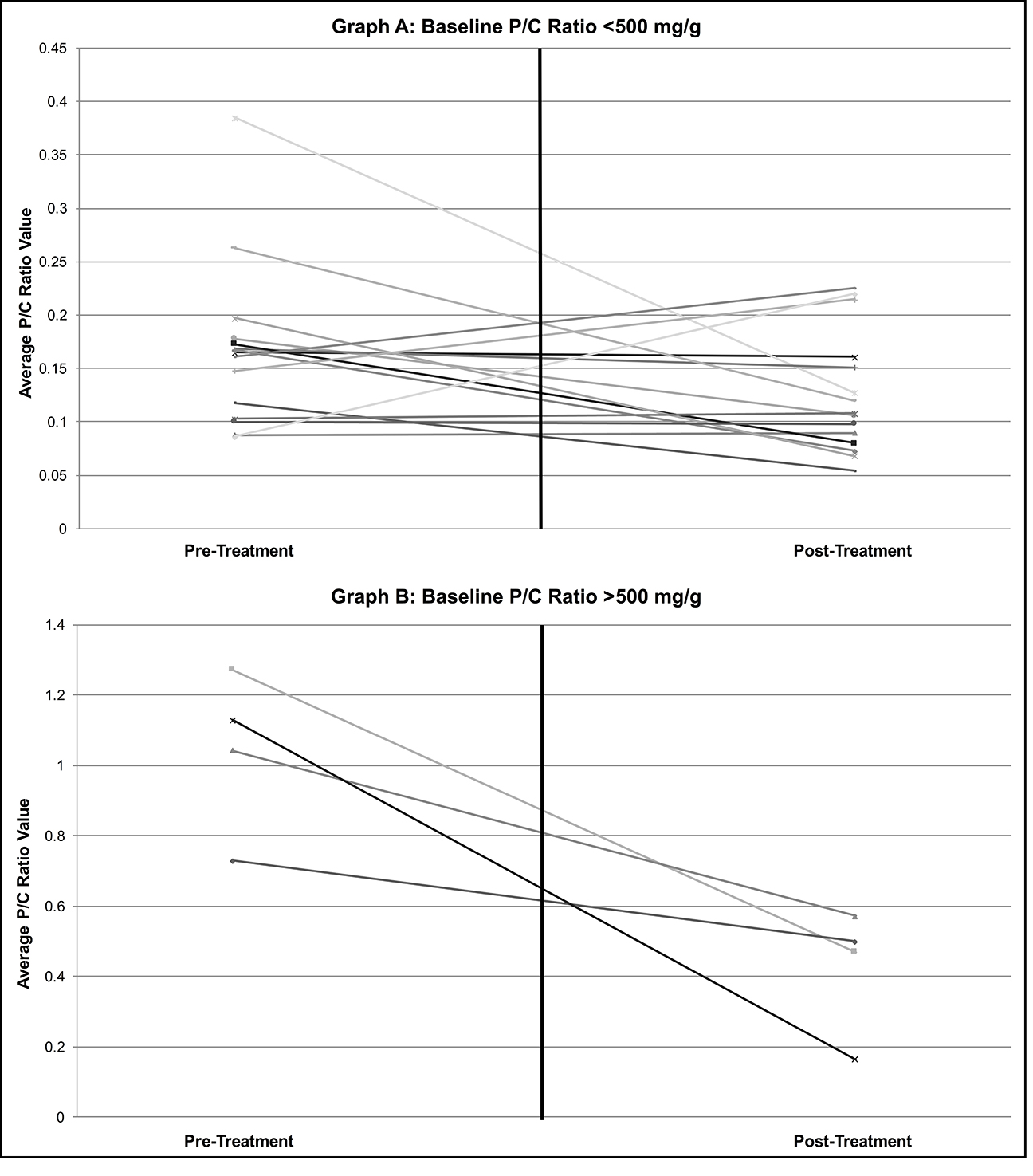 Figure 1. Trends in average P/C ratios pretreatment and post-HCV treatment for patients who had A) baseline average P/C ratios < 500 mg/g; and B) baseline average P/C ratios > 500mg/g. For each participant, average P/C ratios were extracted from 3 longitudinal P/C ratios obtained immediately preceding and following HCV treatment during routine care. P/C ratios decreased in 14 of 19 patients (74%) with median change of -0.072 (median percent change = -40%). Wilcoxon signed-rank test Overall, posttreatment P/C ratios (median = 0.127) were significantly lower (P = 0.01) than pretreatment ratios (median = 0.168).