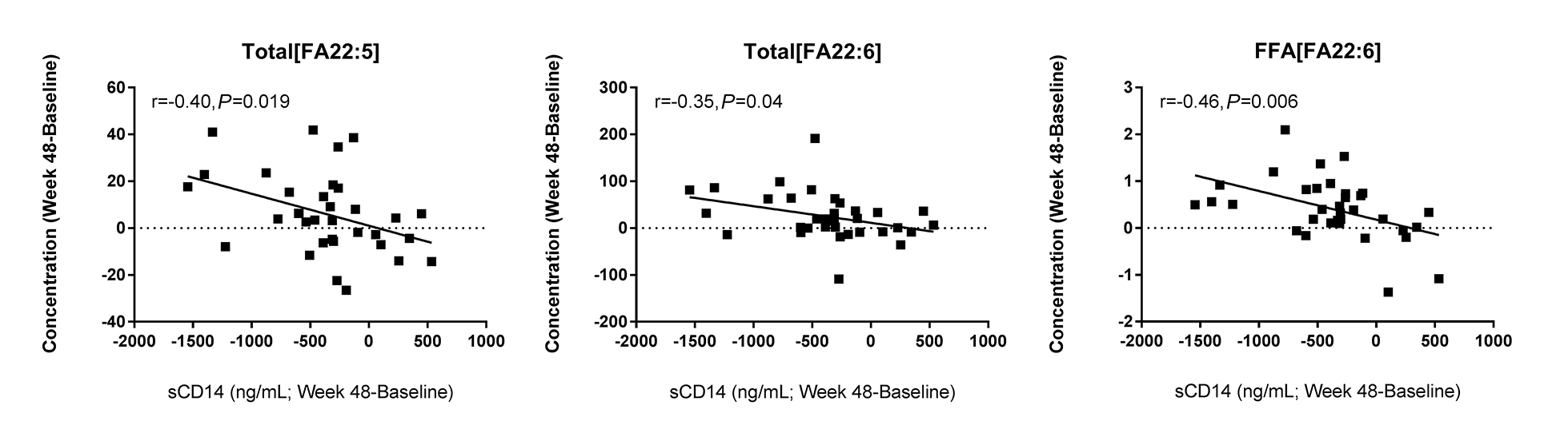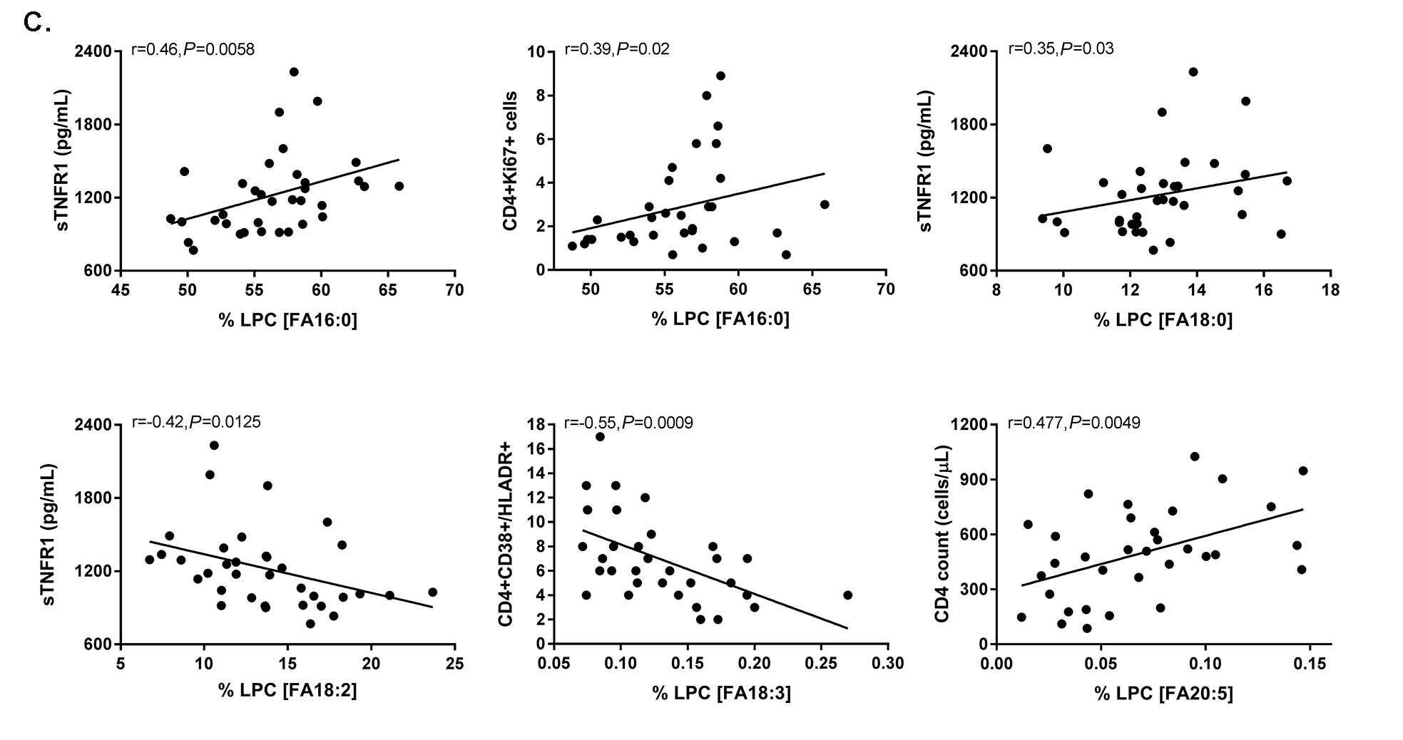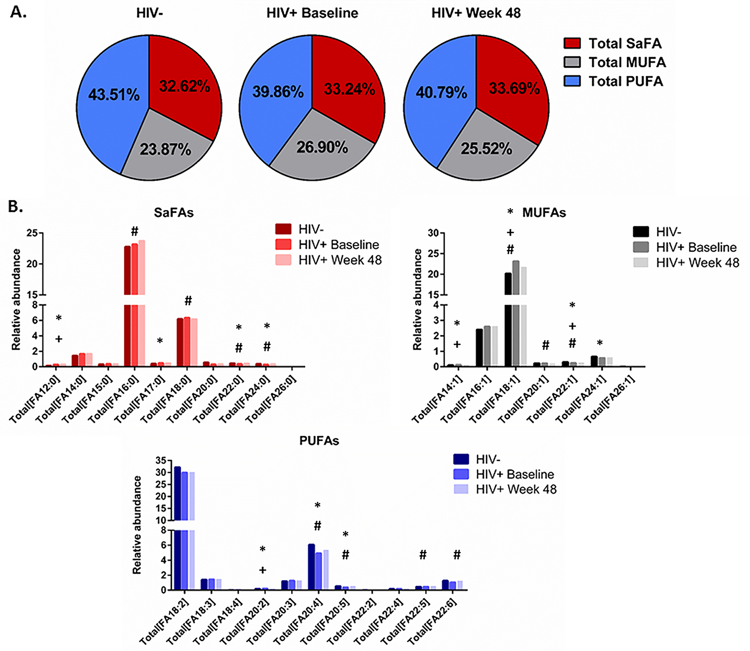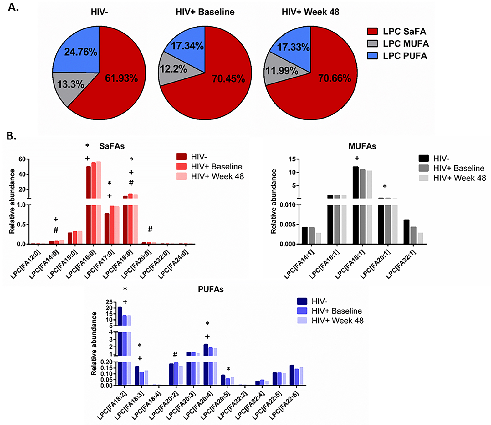 Results: The levels of SaFA, including palmitic (16:0) and stearic (18:0) acid were enriched in HIV+ participants (pre- and post-ART), and SaFA levels were often positively correlated with levels of immune activation (ie, IL-6, sCD14, and TNFR1) at baseline and week 48. Levels of PUFAs (including 18:3, 20:4, and 20:5) were lower in HIV+ participants at baseline compared to levels in HIV- participants (P<0.01), and levels of these PUFAs were increased following 48 weeks of ART. Levels of PUFAs were often inversely related to immune activation. Levels of LPC were increased in HIV+ participants, both pre- and post-ART vs HIV- participants, and the composition of LPC was enriched for SaFAs among HIV+ individuals. At week 48, several LPC molecules containing SaFAs were positively correlated with levels of sCD14, D-dimer, and TNFR1 (P <0.01), and levels of PUFA-containing LPC (18:3, 20:5, 22:5, 22:6) were positively correlated with CD4+ T cell counts and inversely correlated with sCD14 and IL-6 (P<0.01).