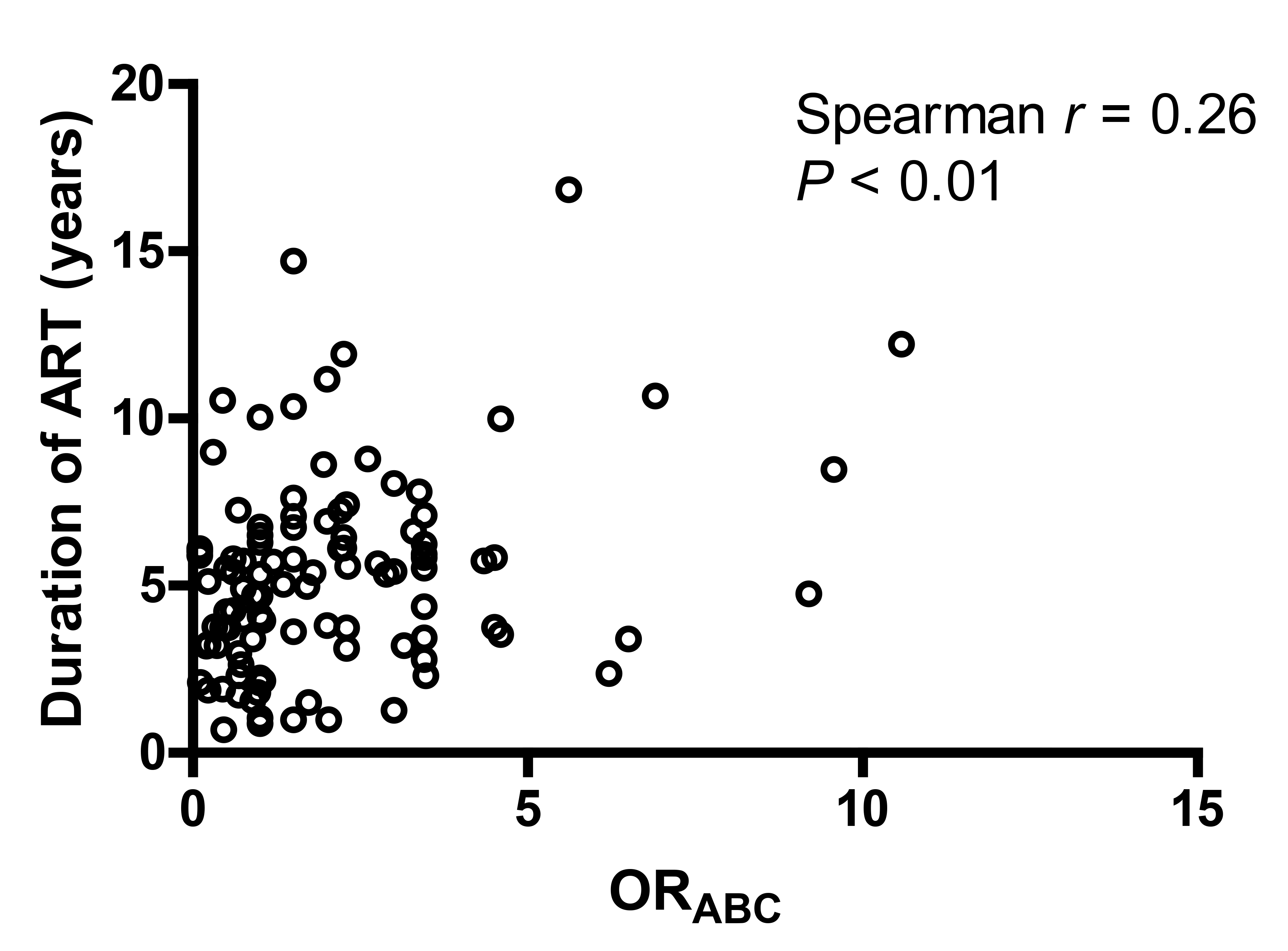 Figure 1. Correlation between ORABC and duration of ART. ORABC represents an overall assessment of protective status and is calculated by multiplying the ORs of HIV control of all 6 alleles at the A, B, and C loci. A lower ORABC is associated with greater control of HIV viremia.