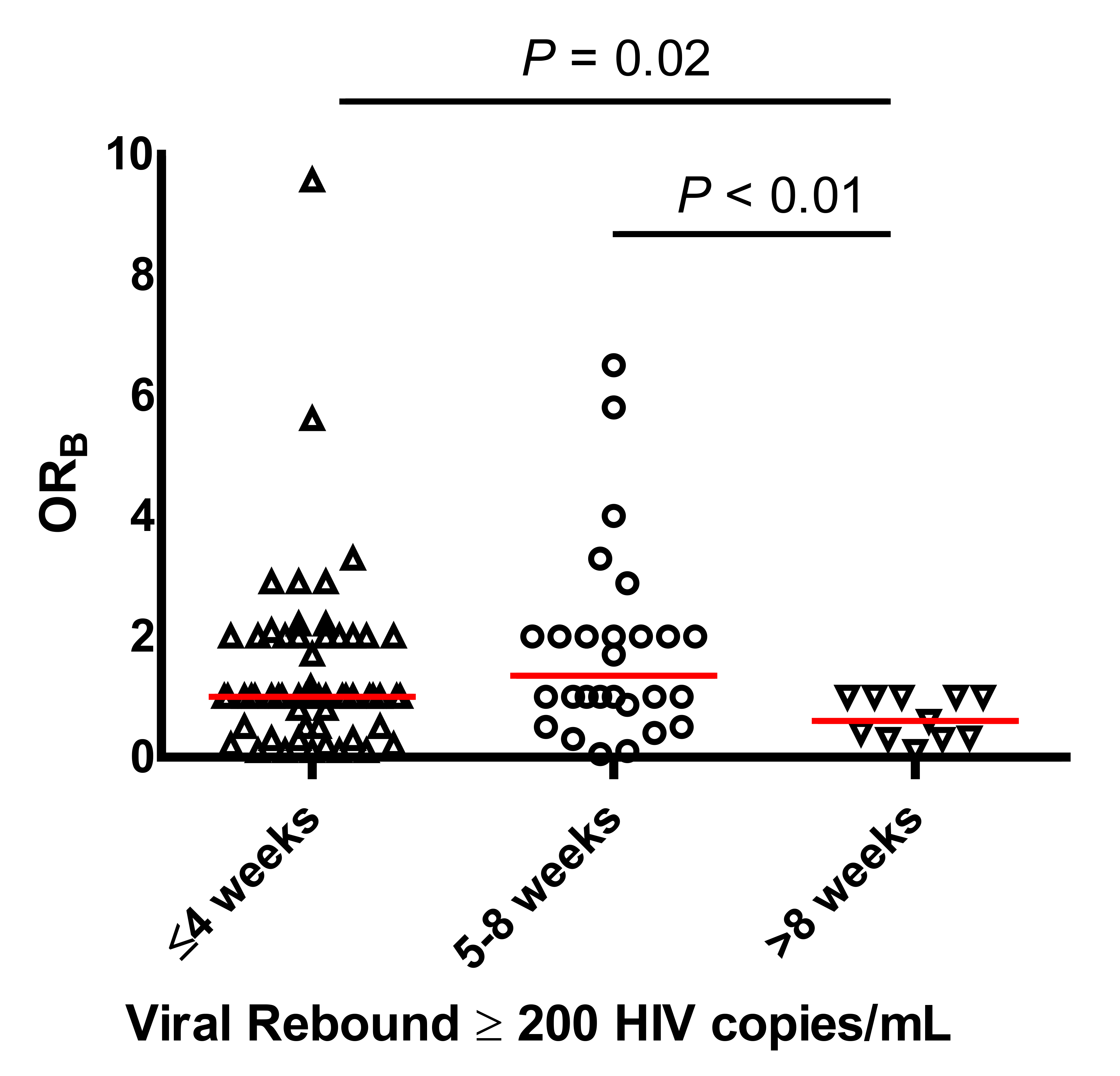 Participants with delayed viral rebound were found to have significantly more protective HLA-B alleles (lower ORB scores) compared to those with early or intermediate rebound times (early vs delayed: median OR B 1 vs 0.6, P = 0.02; intermediate vs delayed: median 1.35 vs 0.6, Figure 2). These results were consistent with the categorical analysis, which showed that there were significant differences in the distribution of viral rebound timing by HLA-B category (P = 0.02, Supplementary Figure 1). The results were largely unchanged with the single ≥ 1,000 HIV-1 RNA copies/mL definition of viral rebound. No significant associations were found in the protective effect of the HLA alleles and either pre-ATI levels of HIV DNA, CA-RNA, or the post-ATI viral load set point.