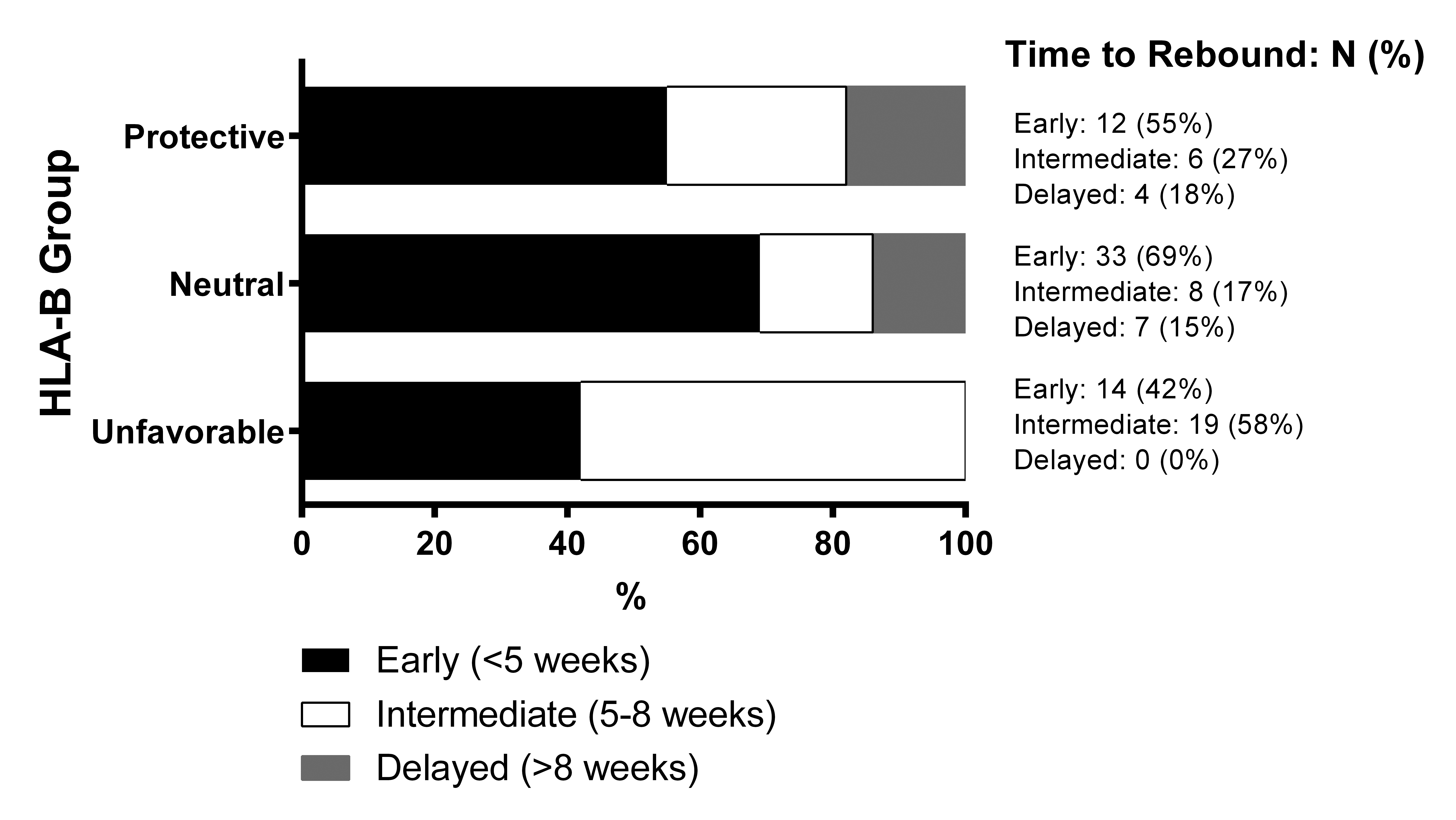 Supplementary Figure 1. Univariate analysis of associations at HLA-B locus. Proportions of participants in HLA-B groups grouped based on their time to viral rebound to ≥ 200 HIV RNA copies/mL.