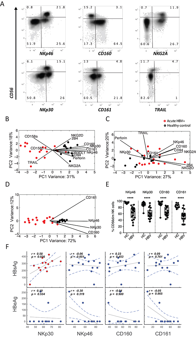 Figure 1. Distinct NK-cell profiles exist among healthy controls and HBV-infected individuals. (A) Flow plots depict the expression of a number of candidate receptors on NK-cell populations in a representative candidate in the cohort, displaying discrete separation in CD3-CD56+CD16+/- NK cells. (B-C) The score plots of the principle component analysis for CD56dim NK cells (B) and CD56bright NK cells (C) from both healthy controls (black) and HBV-infected individuals (red) were built based on all immunophenotyping features. The contribution of the features to group separation were visualized by the lines in the plots, where the length of the line is proportional to how important that feature is to pulling data in its direction. (D) To further avoid over-fitting, caused by correlated changes in NK-cell markers, a second PCA was performed on CD56dim NK cells using the most significantly altered features. (E) Pairwise comparison of the 4 top features, on CD56dim NK cells, were compared in a univariate analysis. (F) Finally, spearman correlations between HBsAg/HBeAg levels and NKp30, NKp46, CD160, and CD161 levels on CD56dim NK cells show the relationship between these markers and HBV antigen load in HBV-infected individuals.