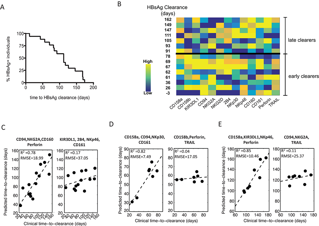 Figure 2. Predictions of time-to-HBV clearance using NK-cell profiles. (A) A Kaplan–Meier survival curve depicts the time to HBsAg clearance across all HBV-infected individuals, demonstrating a broad range of clearance rates. (B) The acute CD56dim NK-cell marker profile with the corresponding time to clearance of HBsAg. (C-E) A PLSR-predicted time-to-clearance, after feature reduction, was performed (C) across the complete HBV+ cohort, (D) early clearers and (E) late clearers (early versus late were separated by the median time-to-clearance, 83 days). For each group the robustness of model prediction, presented as R-squared and root-mean-square-error (RMSE), was evaluated between the best set of the variables (left panel) versus randomly selected variables (right panel).
