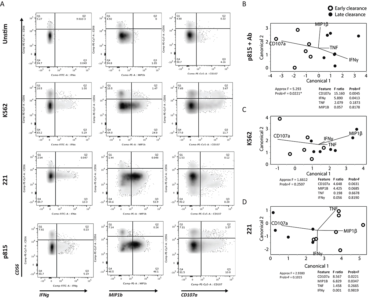 Figure 3. NK-cell degranulation as a correlate of HBsAg clearance. NK-cell activity was assessed following NK-cell stimulation with antibody-opsonized target cells to drive antibody dependent cellular cytotoxicity; ADCC (antibody+p815 cells), NKG2D activation (K562), or NCR activation (221). (A) Flow plots show the level of degranulation by CD107a, and cytokine (IFNγ) and chemokine (MIP1β) production on NK-cell populations in 3 stimulated as well as unstimulated conditions. (B-D) A multivariate PLSDA was used to differentiate the profiles of the early and late clearers activated via (B) ADCC, (C) NKG2D, and (D) NCR, distributed in the first 2-dimensional principle components, based on 4 measured features (CD107a, IFNγ, TNF, and MIP1β). The contribution of the features to group separation were visualized by the lines in the plots, and its F ratio and P -values were listed on the right side based on Approximate F tests.