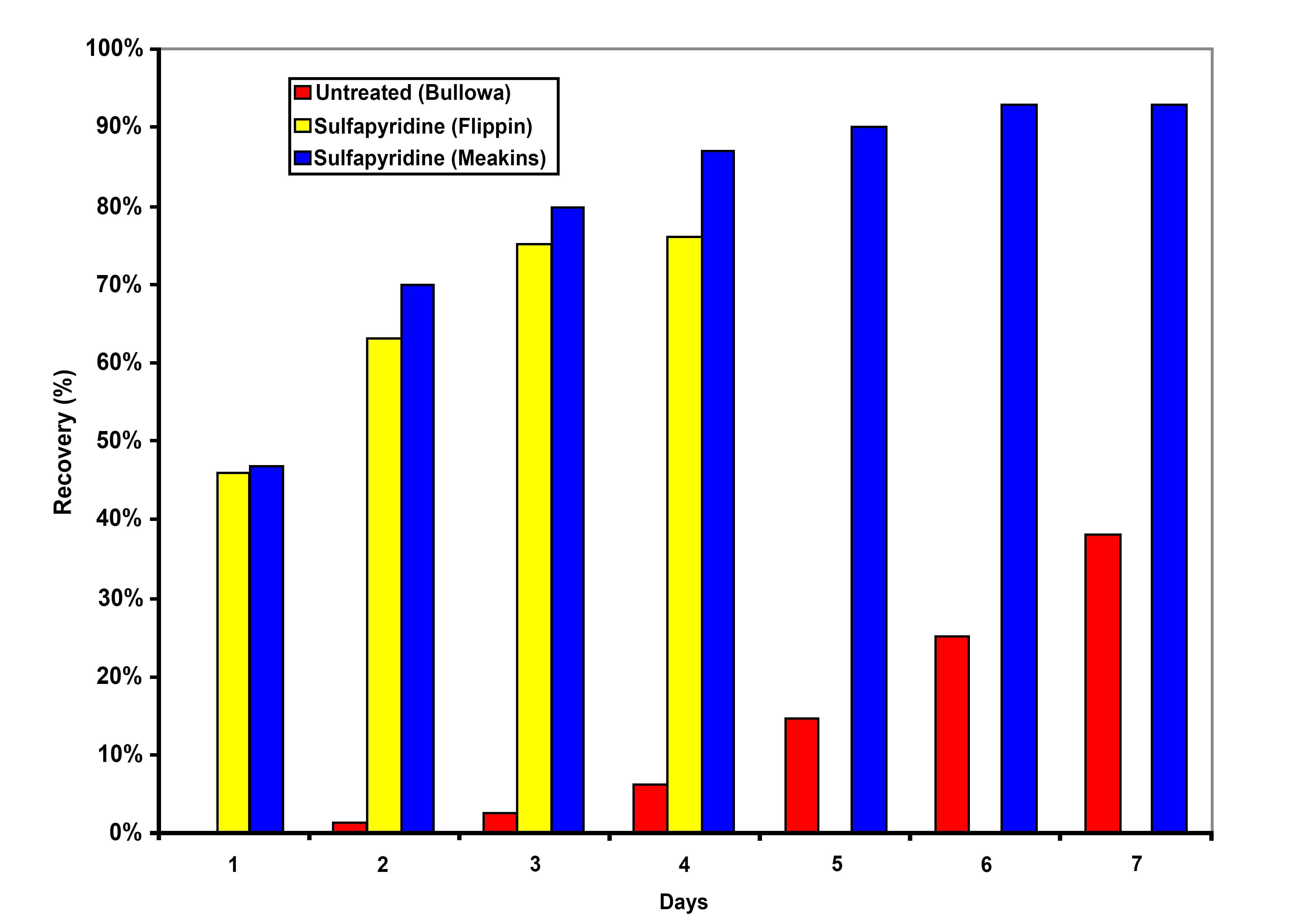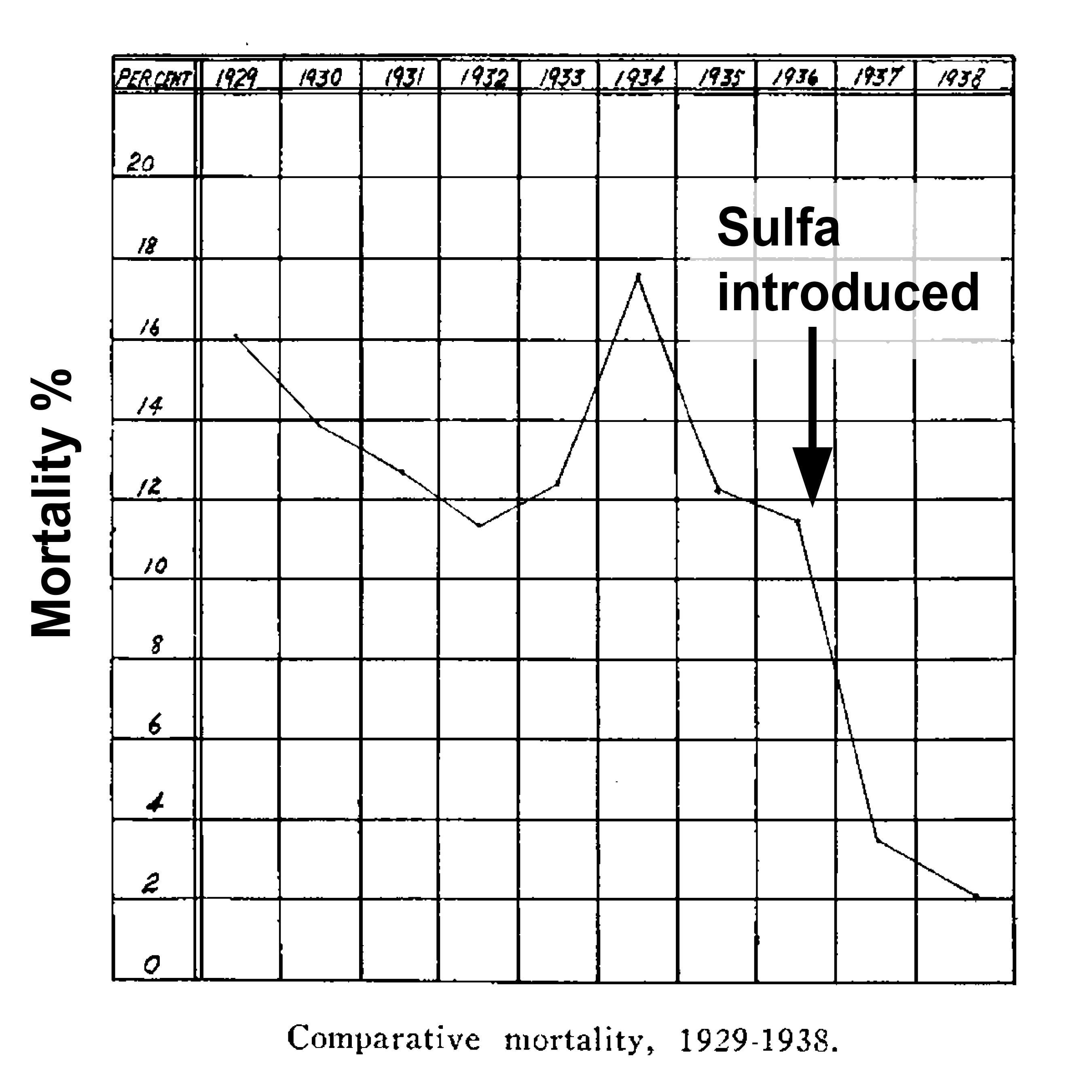 Pneumonia was also a deadly disease and when due to Streptococcus pneumoniae was referred to as the “captain of the men of death." Approximately 30% of patients would succumb [2] to this infection. If the patient was bacteremic, 70-90% mortality was expected. Among survivors, only 30% were afebrile at one week. Therapy with penicillin reduced the mortality of bacteremic pneumonia to 17% [3]. Sulfonamide therapy resulted in 70-80% of patients being afebrile within three days [2, 4-6] (Figure 2). These are dramatic, some would say miraculous, treatment effects.