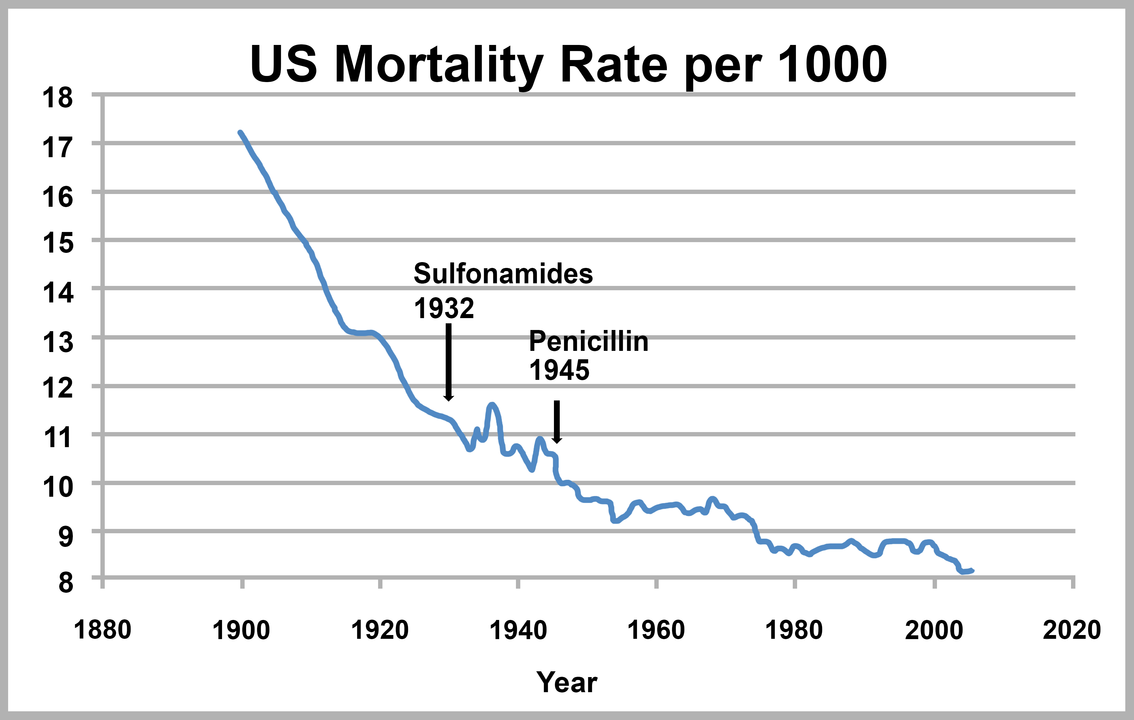 Endocarditis was a uniformly fatal infection before antibiotics [7]. Today, mortality rates overall are around 20% with antibiotics and with surgery when indicated [8]. Mortality associated with infectious diseases was declining by the beginning of the 20th century, and this decline accelerated (with the exception of the 1918 influenza pandemic) with the introduction of sulfonamides and penicillin in the 1930s and 40s (Figure 3) [9]. Truly, antibiotics are a miraculous resource.