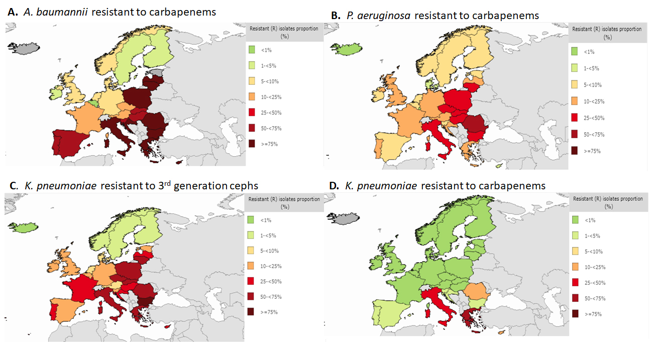 As a result of the widespread prevalence of resistance to expanded-spectrum cephalosporins, the reduced efficacy of these cephalosporins due to resistance has led to increasing use of carbapenem antibiotics for common health care-associated infections. This, in turn, has resulted in the predictable emergence of carbapenem-resistant Enterobacteriaceae [29]. The prevalence of carbapenem resistance among K. pneumoniae remains low in most European countries, yet it is present in 50-75% of isolates in Italy and Greece (Figure 4D).