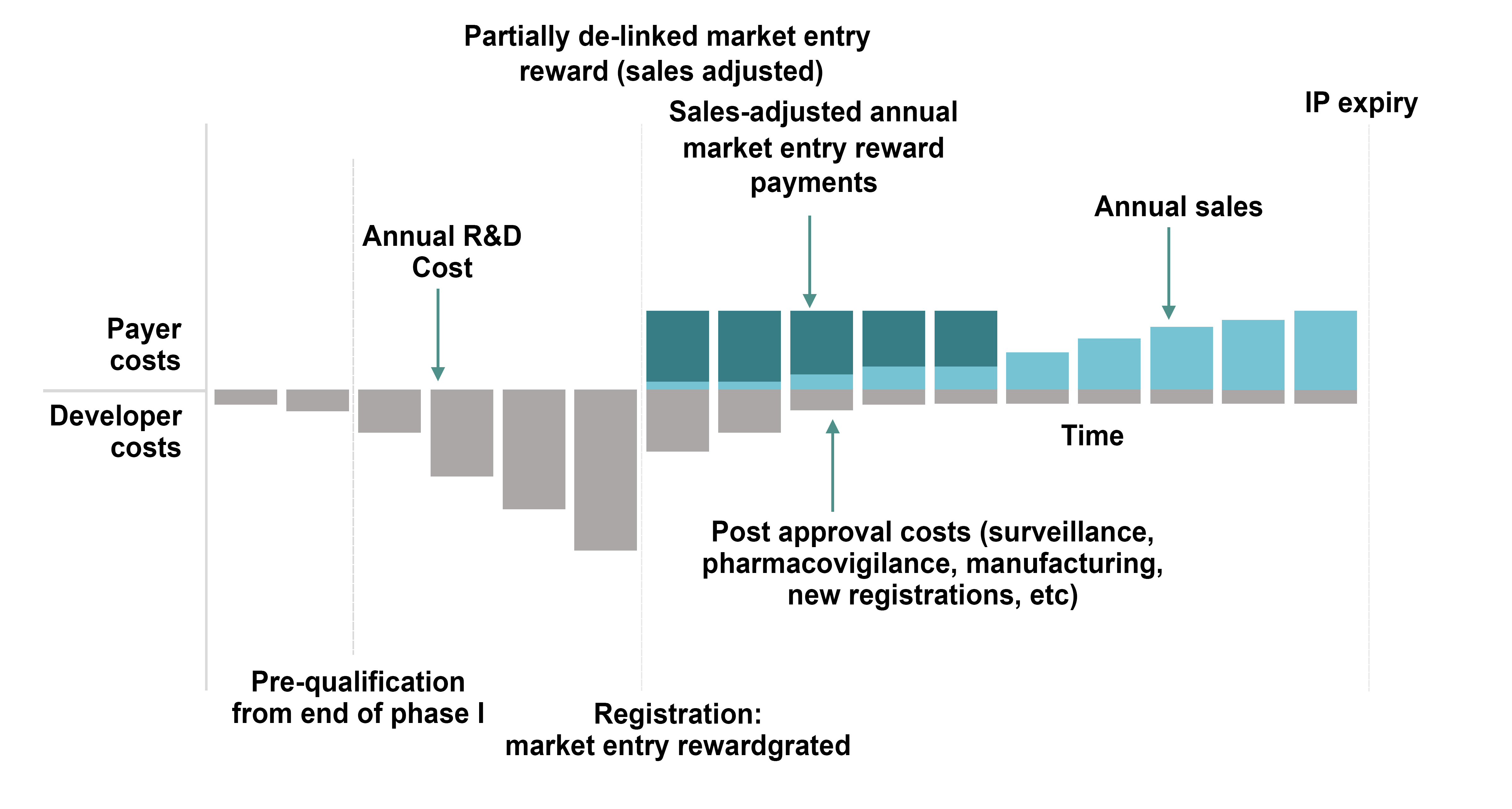 Market entry rewards provide an upfront payment, extended over several years in most models, upon approval of an appropriate new antibiotic. In a fully delinked model, the payment usually provides for no sales or only minimal sales of the new product. In this case the payment would be higher than that for other models. On the other hand, even though sales volume and revenues are delinked, hospitals and others would still have to purchase the new antibiotic at a certain price. This approach helps assure appropriate antibiotic stewardship. In a partially delinked model such as that preferred by DRIVE-AB (Figure 5) [92], sales are allowed. This approach can provide for generic entries into the market at the end of exclusivity and therefore provides an advantage over fully delinked models.