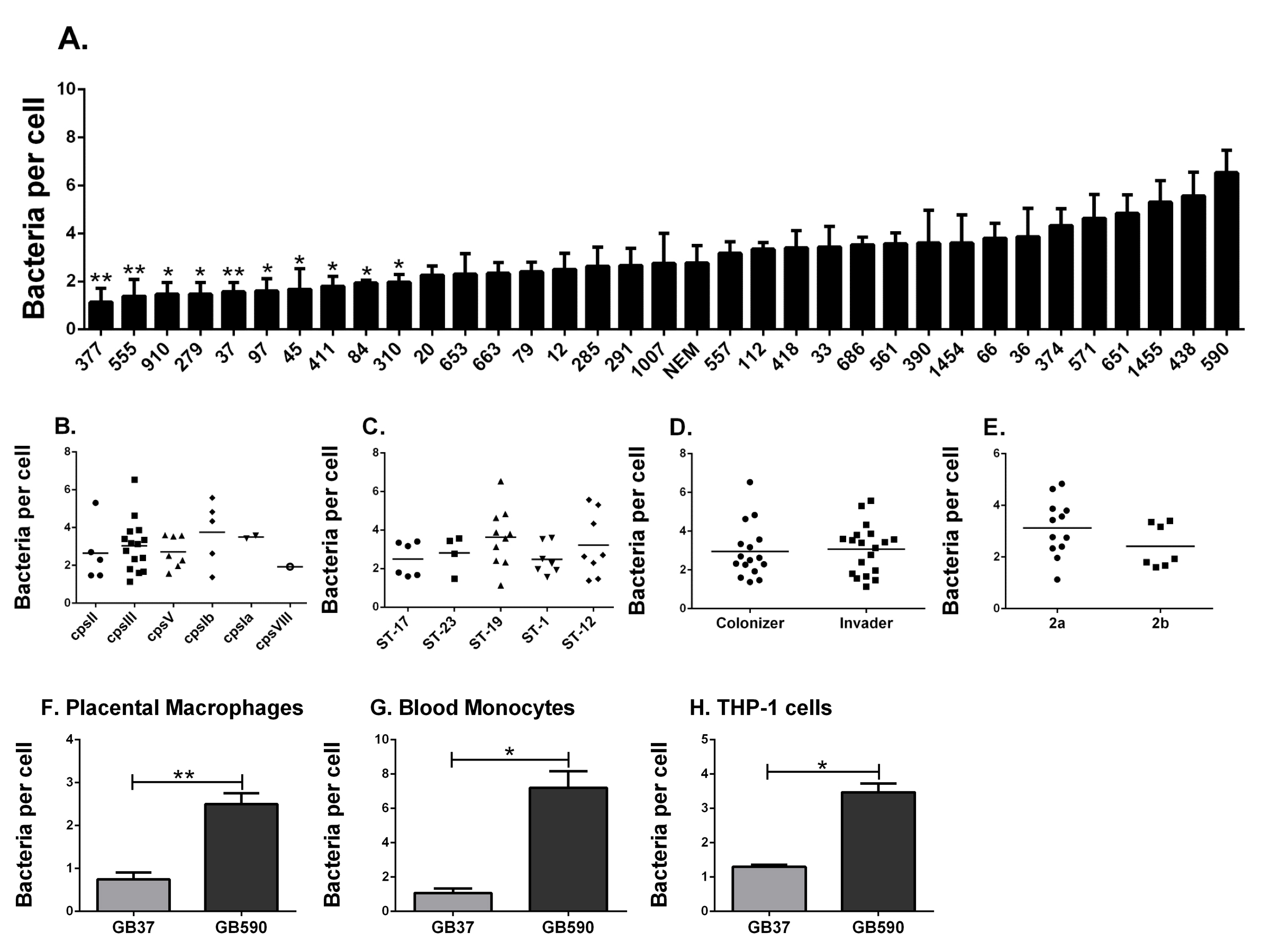 Methods: A high-throughput screen using the phorbol ester-differentiated THP-1 macrophage-like human cell line was used to quantify phagocytosis of a diverse group of 35 different human clinical isolates of GBS representing a wide variety of capsular serotypes. Validation studies were conducted using human primary phagocytes.
