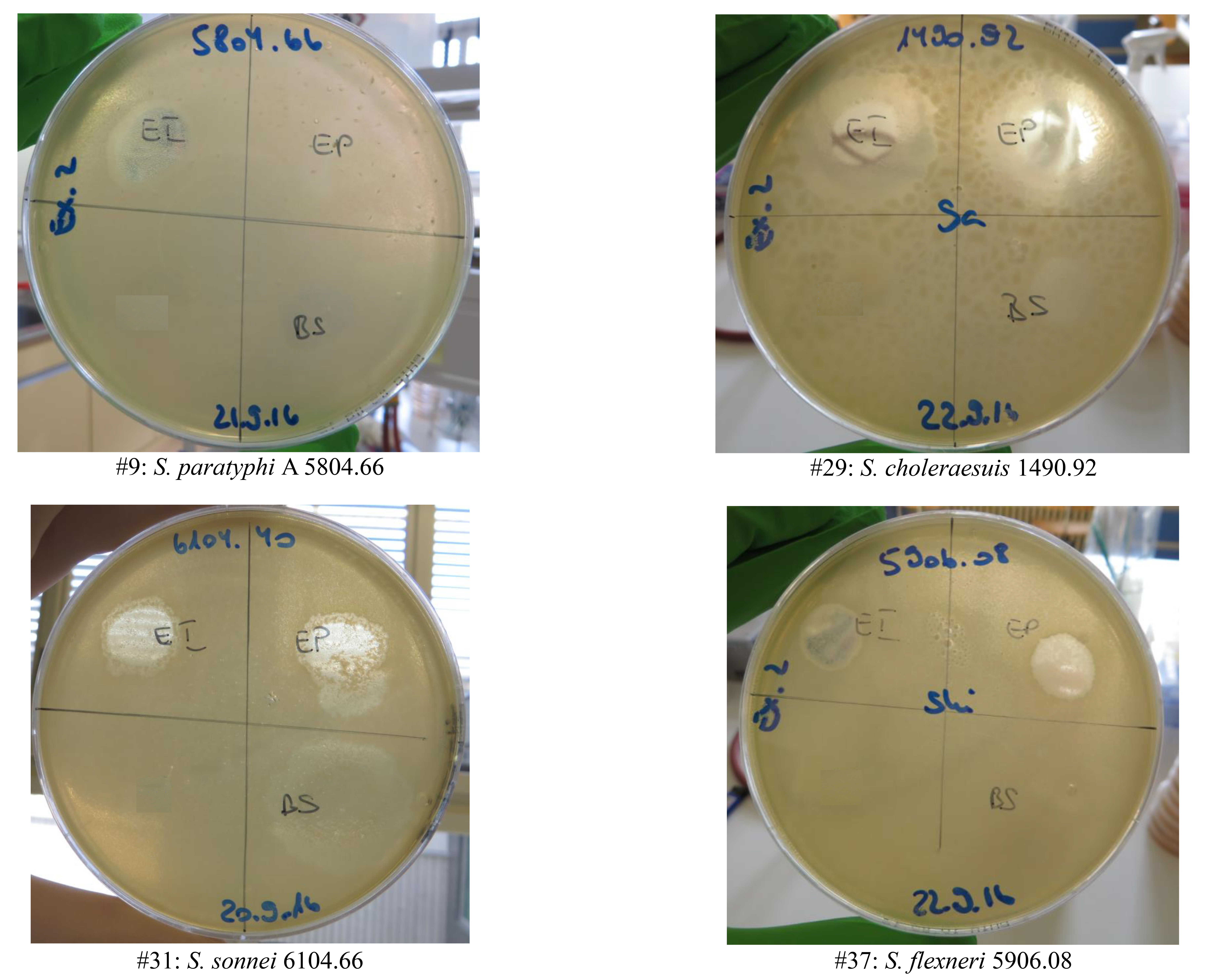 Supplementary Figure 1: examples of bacteriophage susceptibility results (see Supp. Table 1) for 2 Salmonella and 2 Shigella spp. strains. EI, Eliava INTESTI Bacteriophage cocktail; EP, Eliava P YO Bacteriophage (Eliava) cocktail; BS, Biochimpharm Septaphage Bacteriophage cocktail.